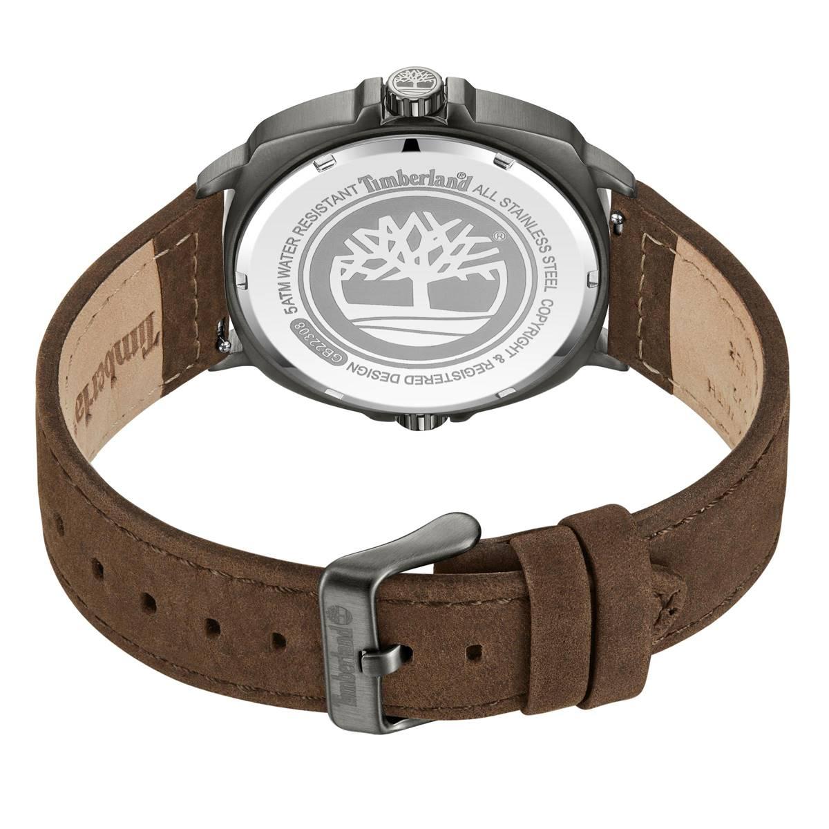 This Mens Timberland Williston three-hand quartz analog watch features a gunmetal-tone 44mm case. The black dial is accented with white indexes and a rotating chapter bezel. The watch is completed with a brown leather strap.