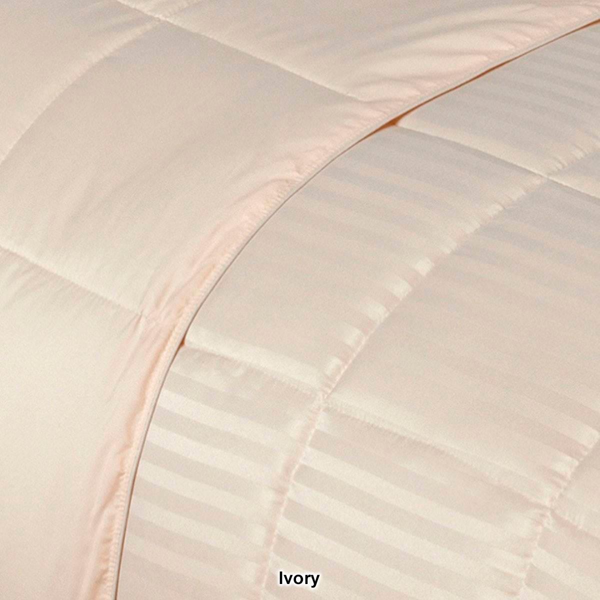 Slip under the covers and sink into the Superior Reversible Down alternative blanket. This design features stripes on one side with a solid reverse that looks gorgeous on its own or can be used as a duvet insert. This beautifully crafted blanket is perfect for year-round comfort.