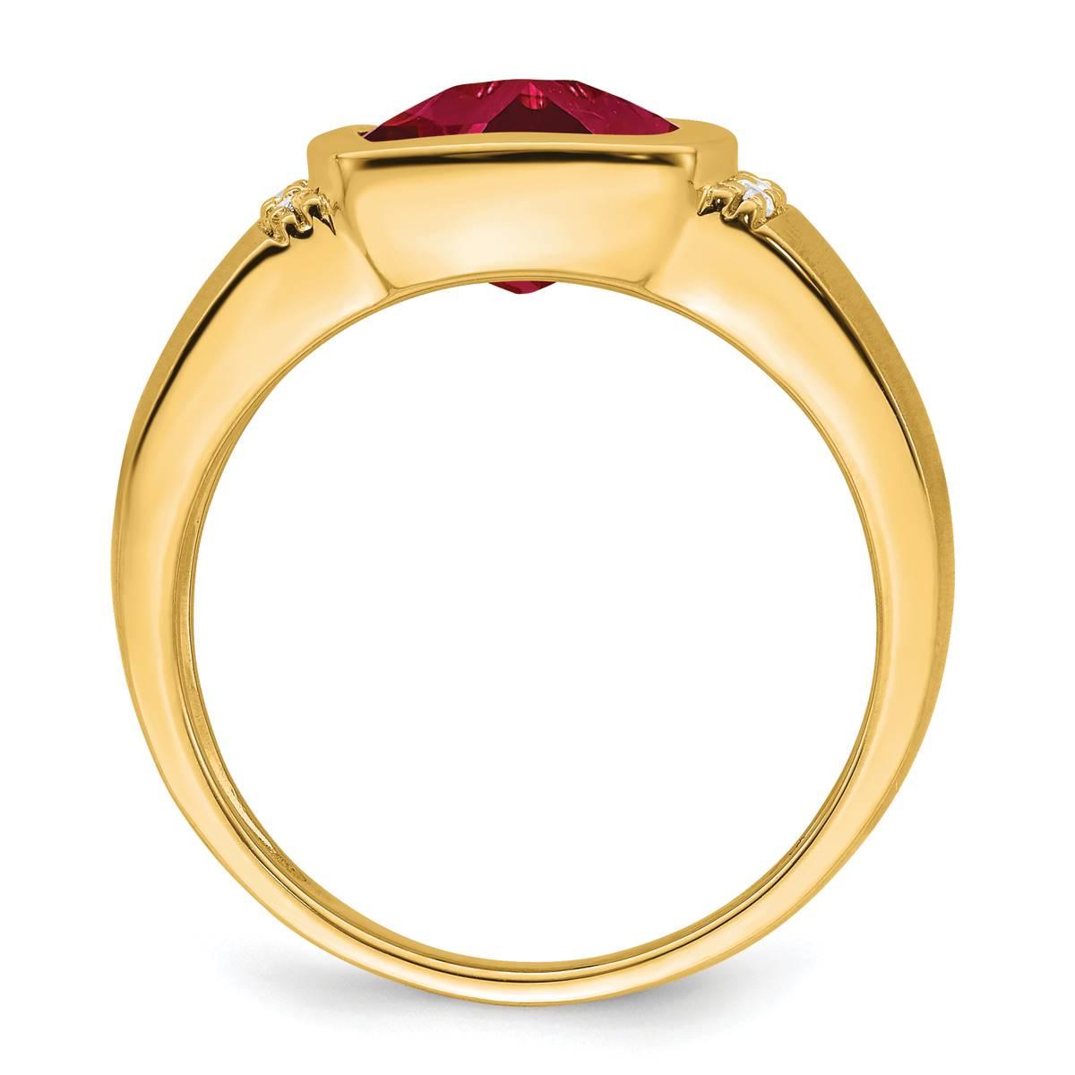 This Mens Gentlemen’s Classics™ 14kt. gold 5ctw. created Ruby ring will never go out of fashion. Features a dazzling 5ctw. cushion-shaped lab-created red ruby gemstone and twinkling 1/10ctw. small round diamonds on the sides.