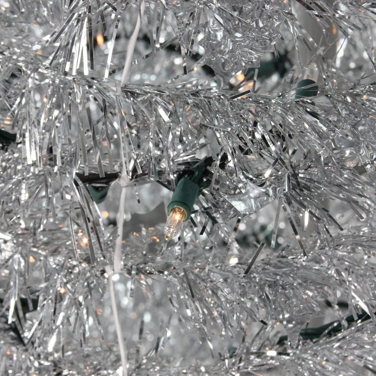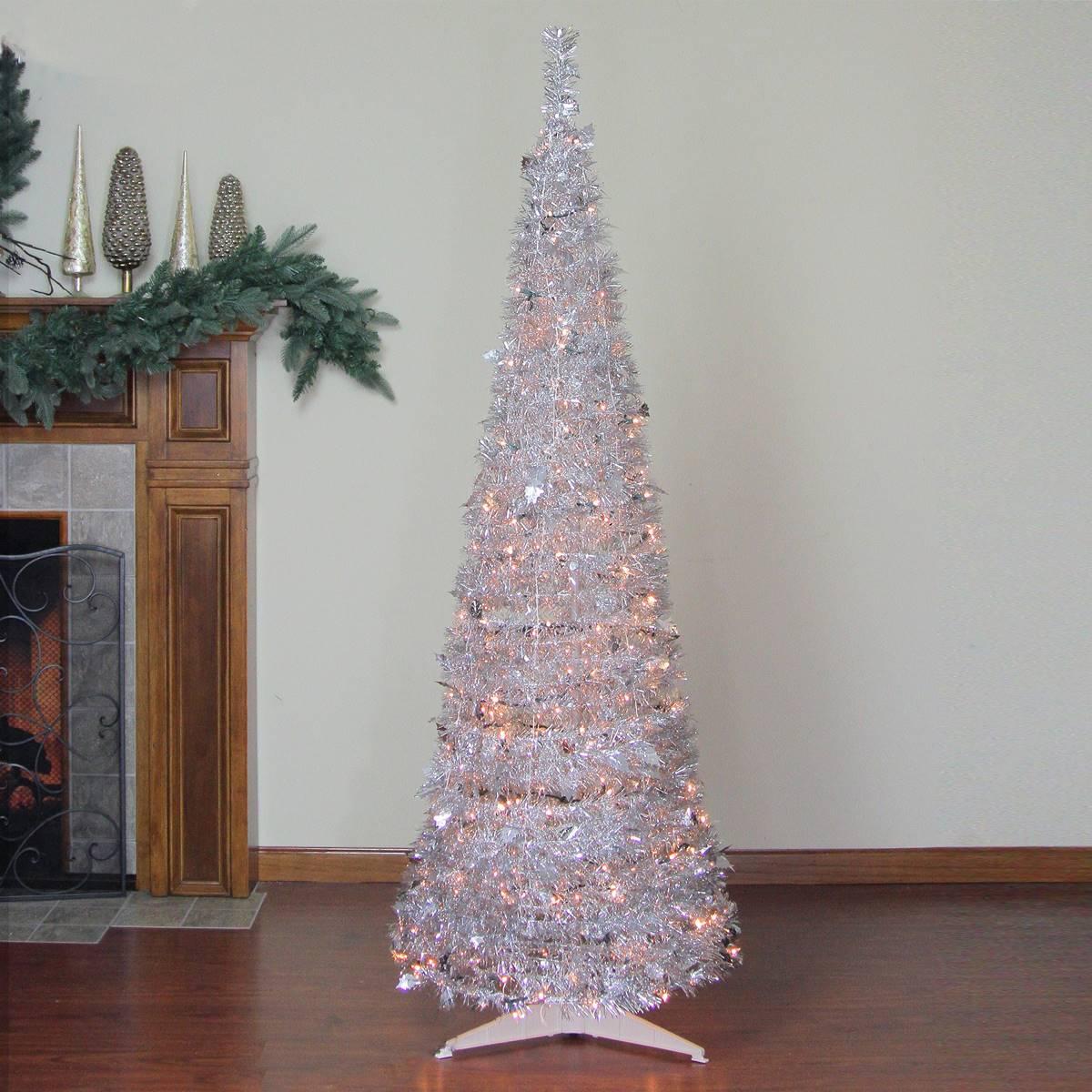 Description This Northlight Seasonal 6 foot silver tinsel "pop up" artificial Christmas tree has collapsible design that allows it to be set up in mere seconds. Pre-lit with 250...