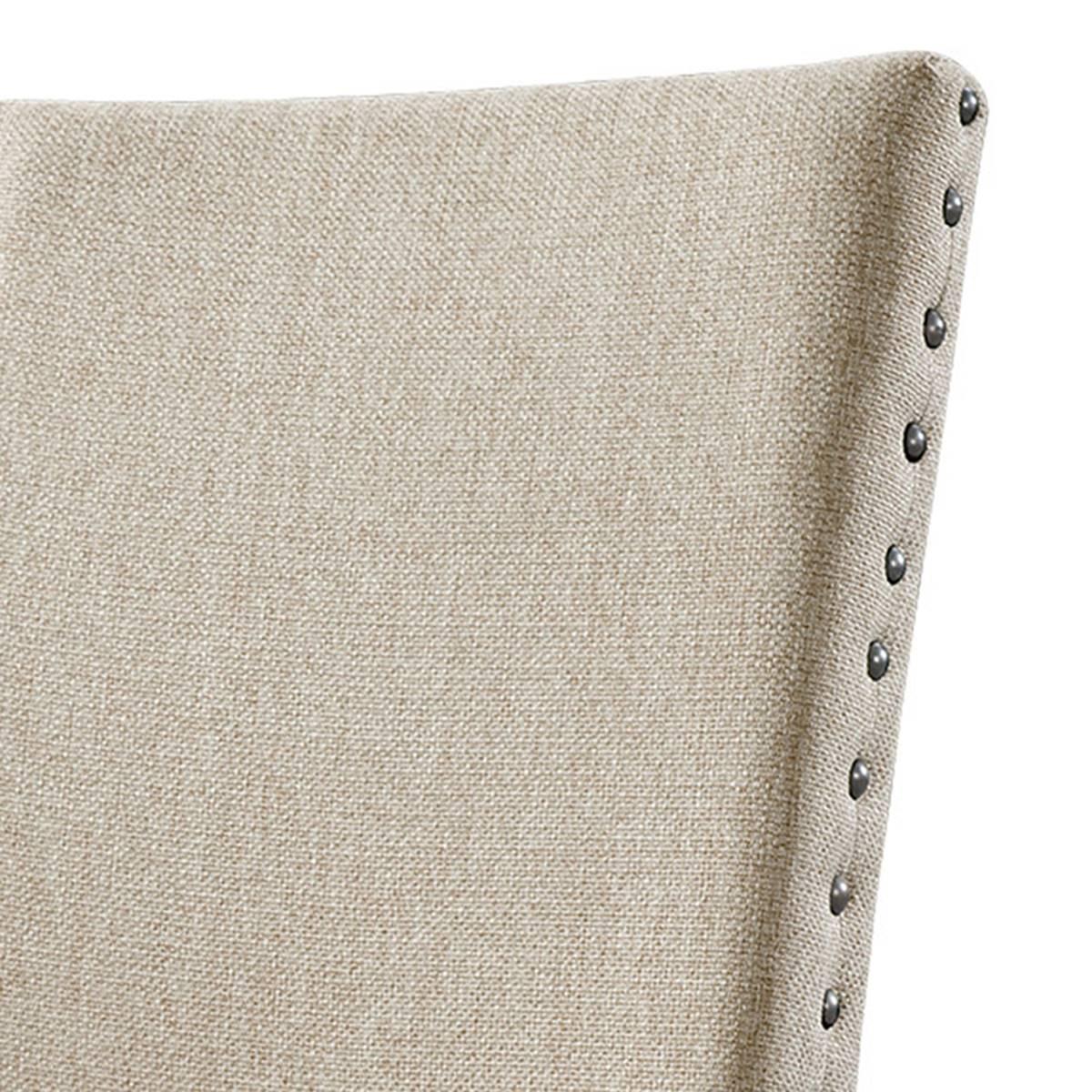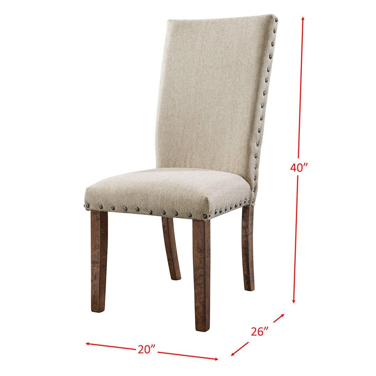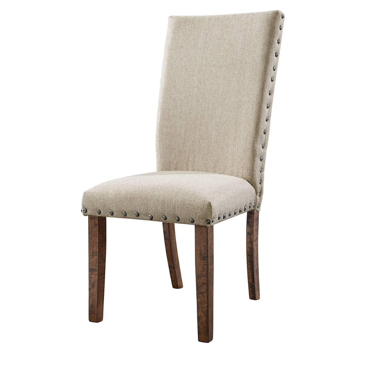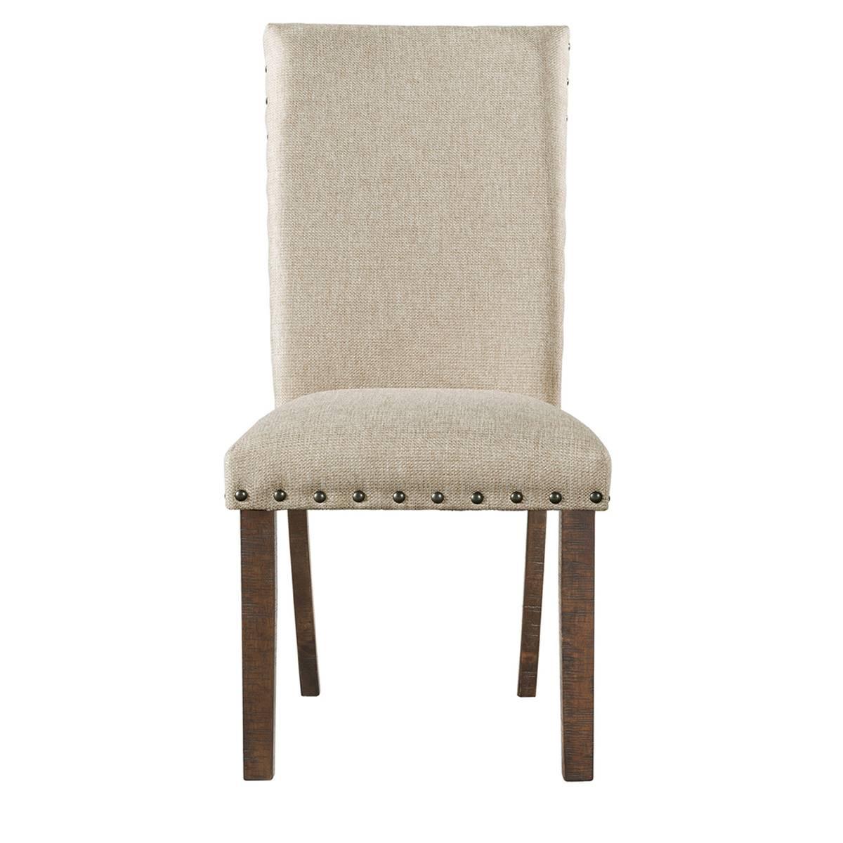 This Elements Jax upholstered side chair set gives your dining room a hint of rustic charm. Its comfy foam filled seats are upholstered in charming cream linen and accented by a metal nailhead trim. Smokey walnut finished legs featuring distress marks give this chair a slightly weathered look and a cozy feel.