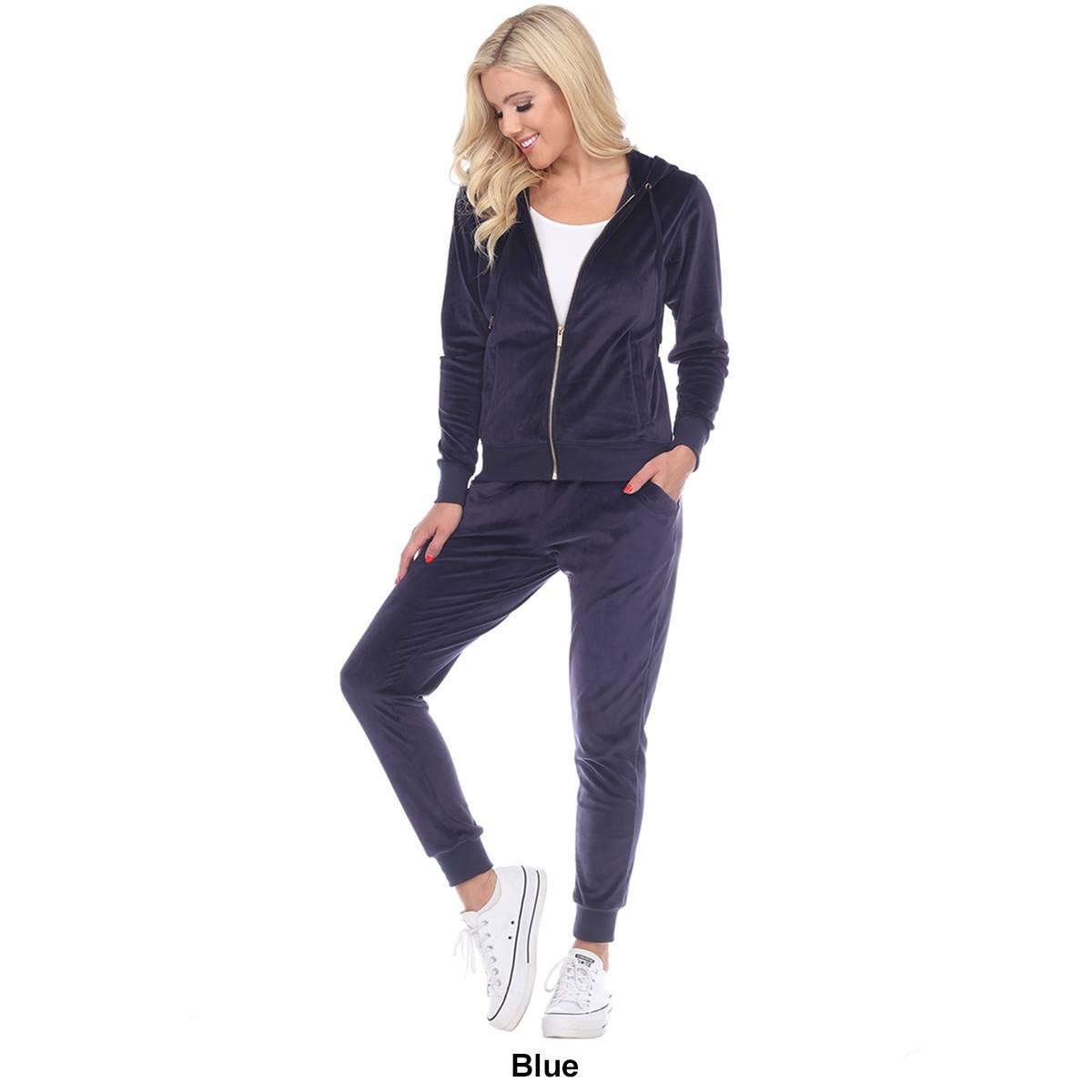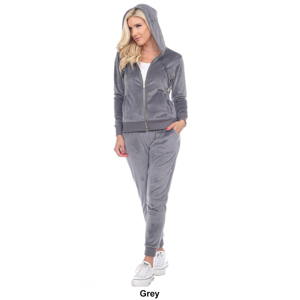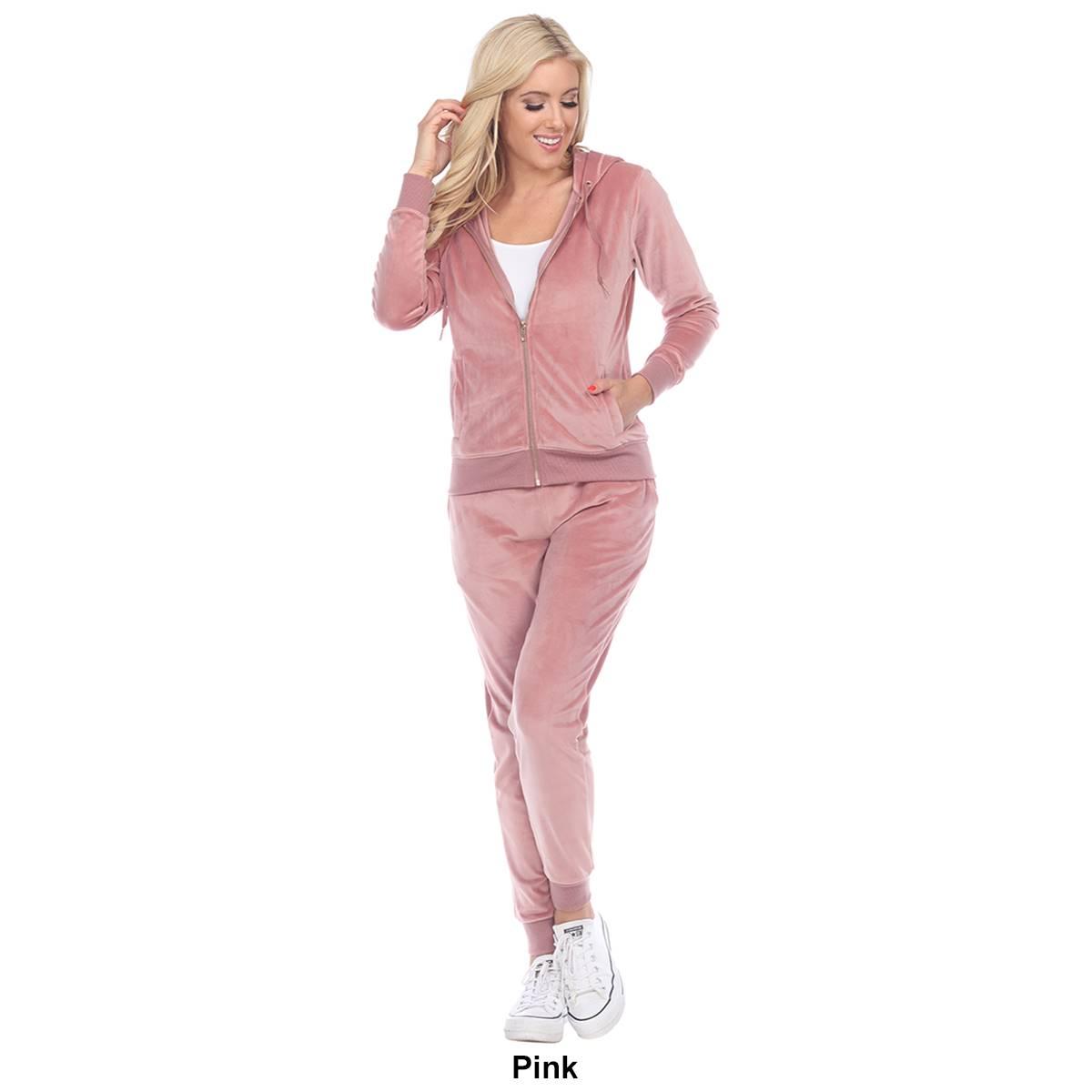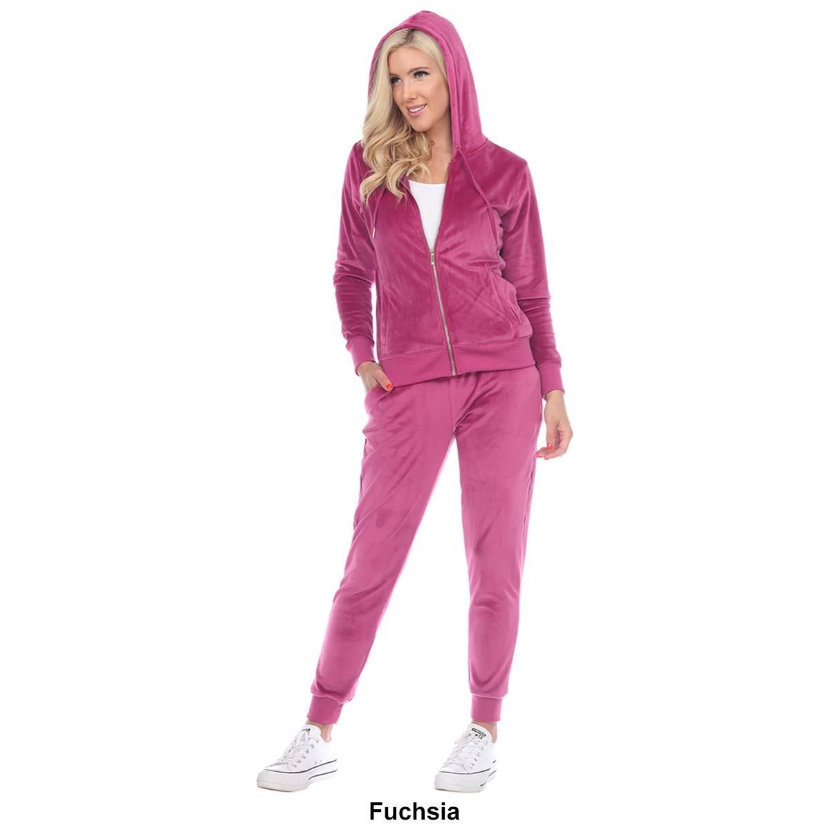 Description This Womens White Mark 2 piece tracksuit features the softest velour with a famous fitted style. The set includes a zip-up hoodie with 2 front half-kangaroo pockets...