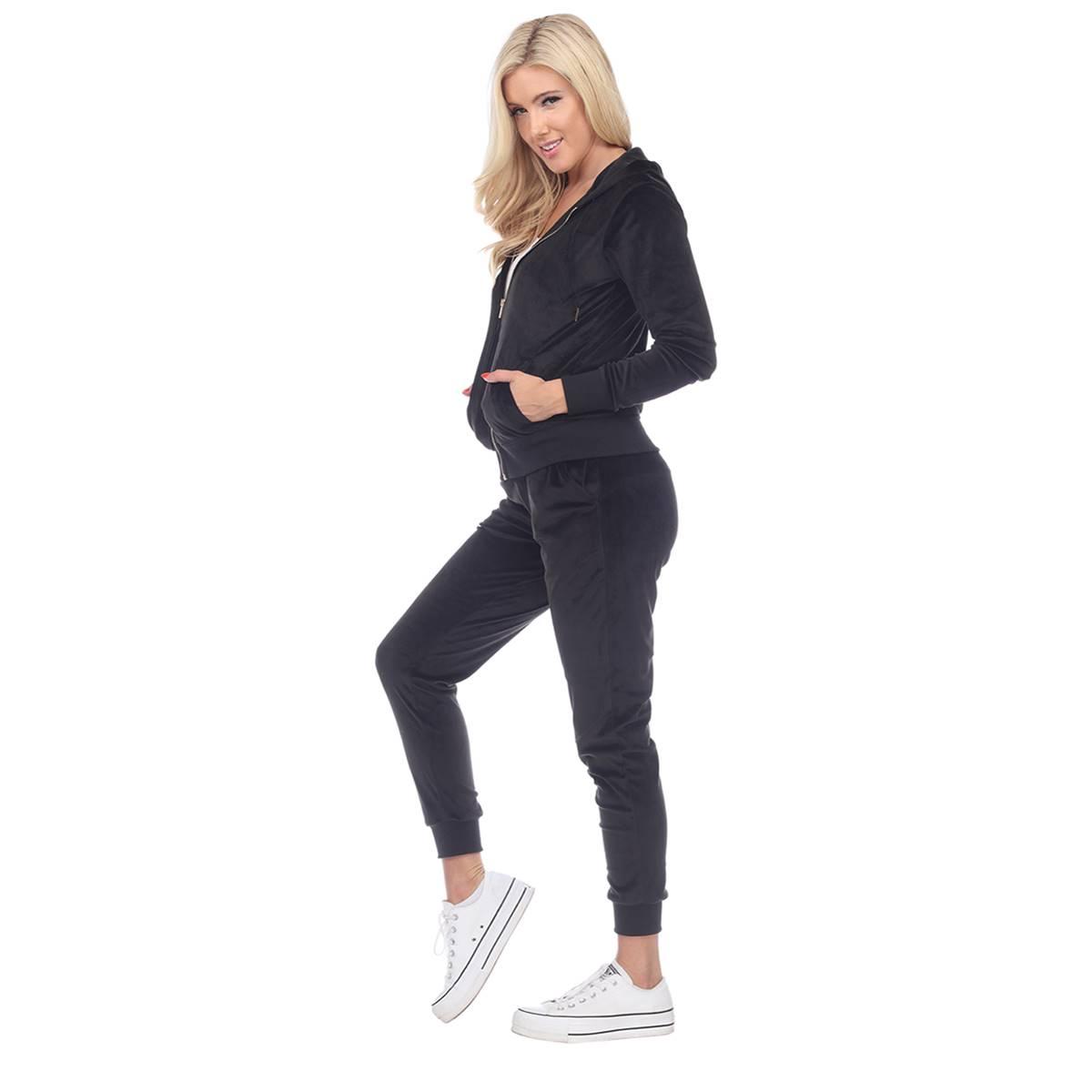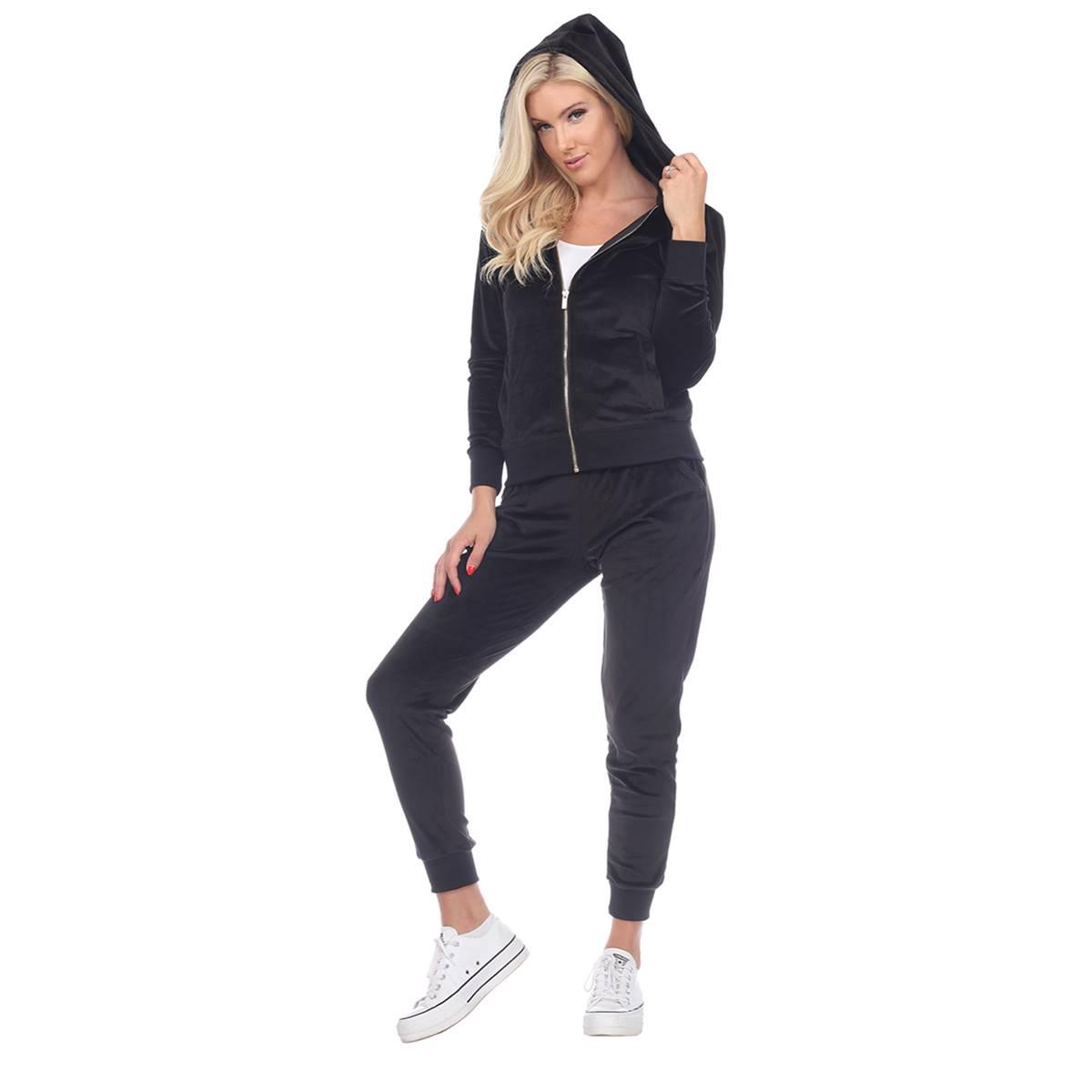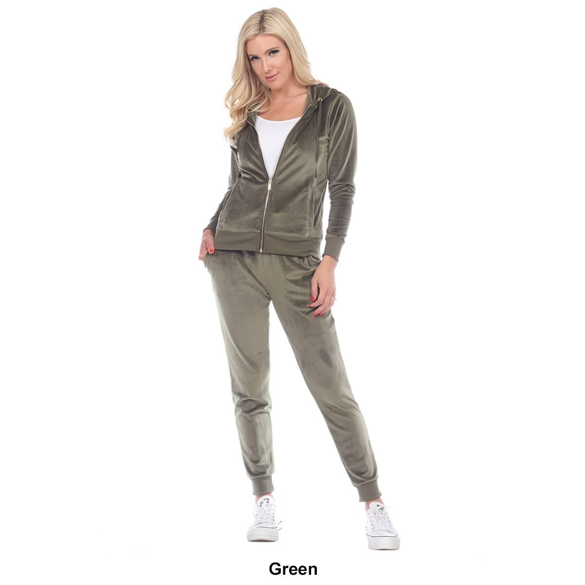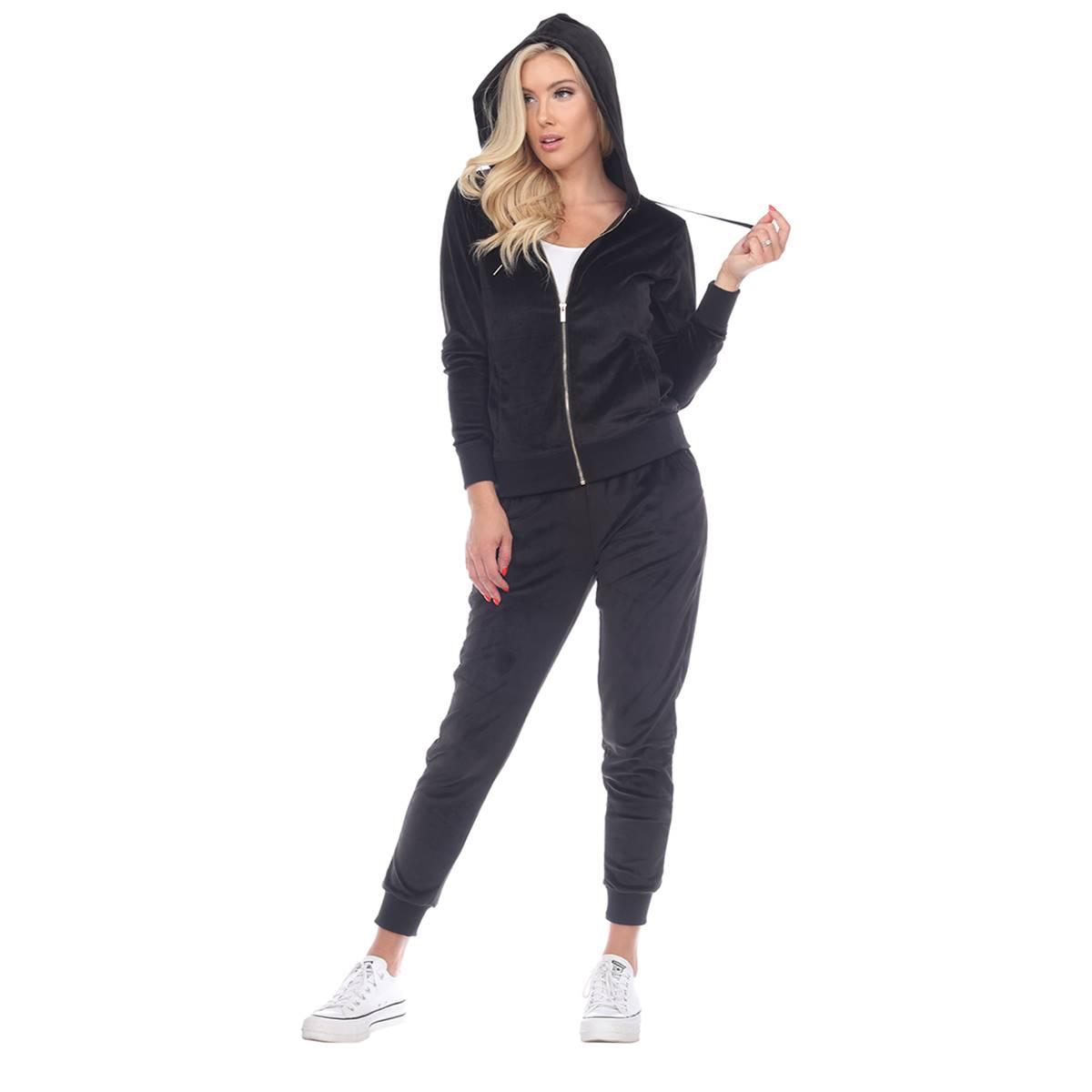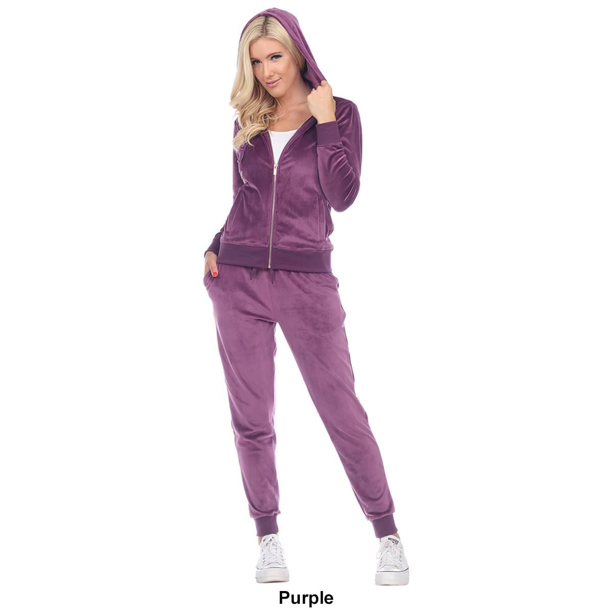 Description This Womens White Mark 2 piece tracksuit features the softest velour with a famous fitted style. The set includes a zip-up hoodie with 2 front half-kangaroo pockets...