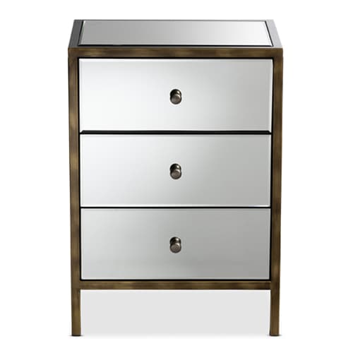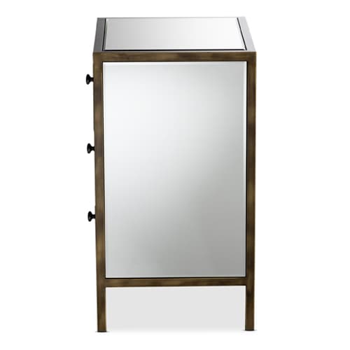 Description This Baxton Studio Nouria 3 drawer nightstand bedside table will upgrade your bedside storage. It is handcrafted from MDF wood and overlaid with mirrors that capture...