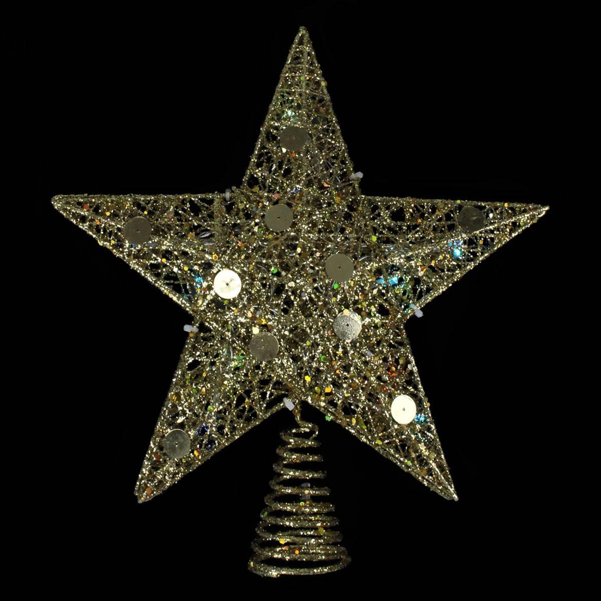 This elegant Northlight Seasonal Gold Glittered Star Christmas Tree Topper adds sparkly light to your Christmas tree. The glittery star encases multi-color LED lights giving the piece a colorful glow. It is the perfect finishing touch for your Christmas tree. If one bulb burns out the rest will stay lit. Comes with a spiral metal cone to attach to the tree.