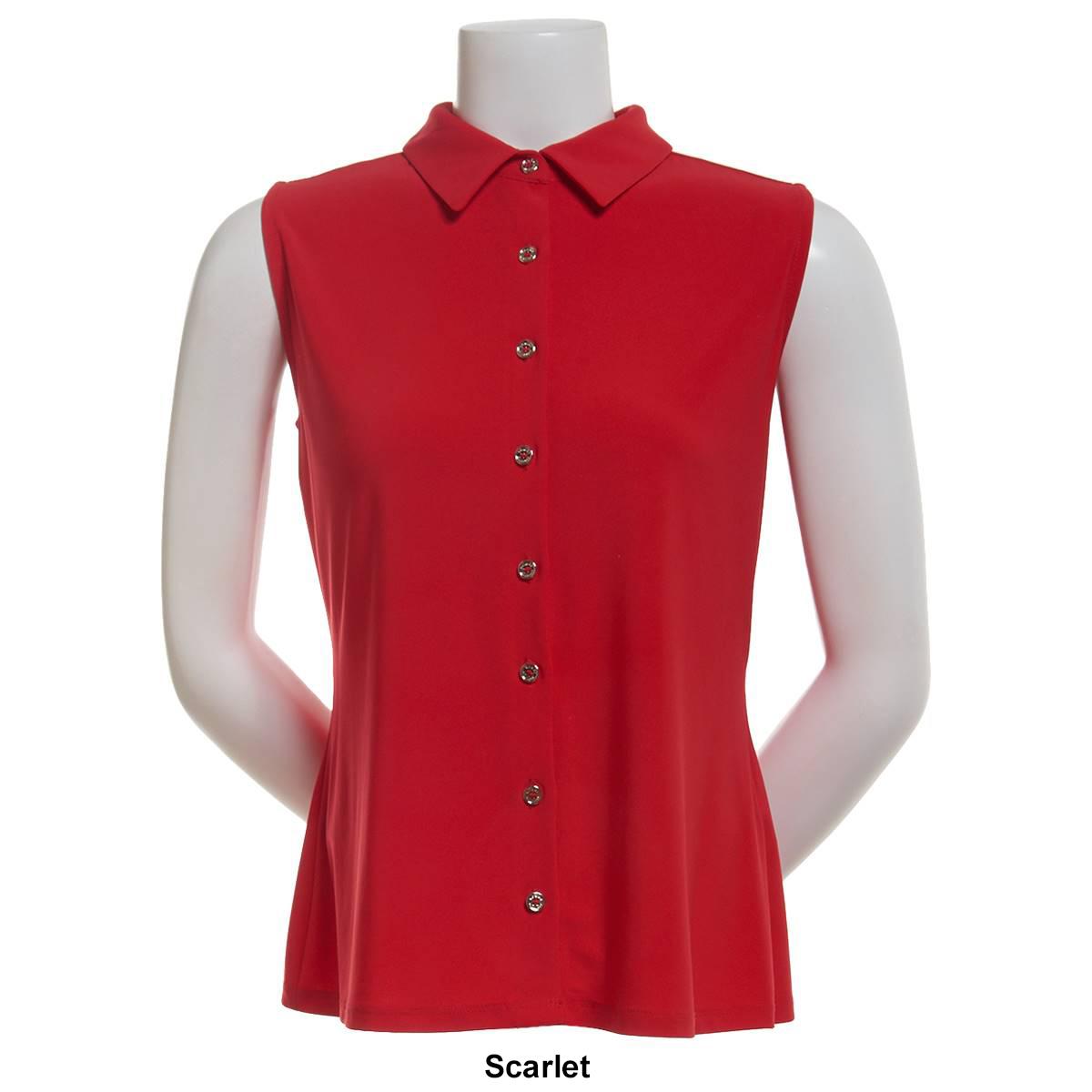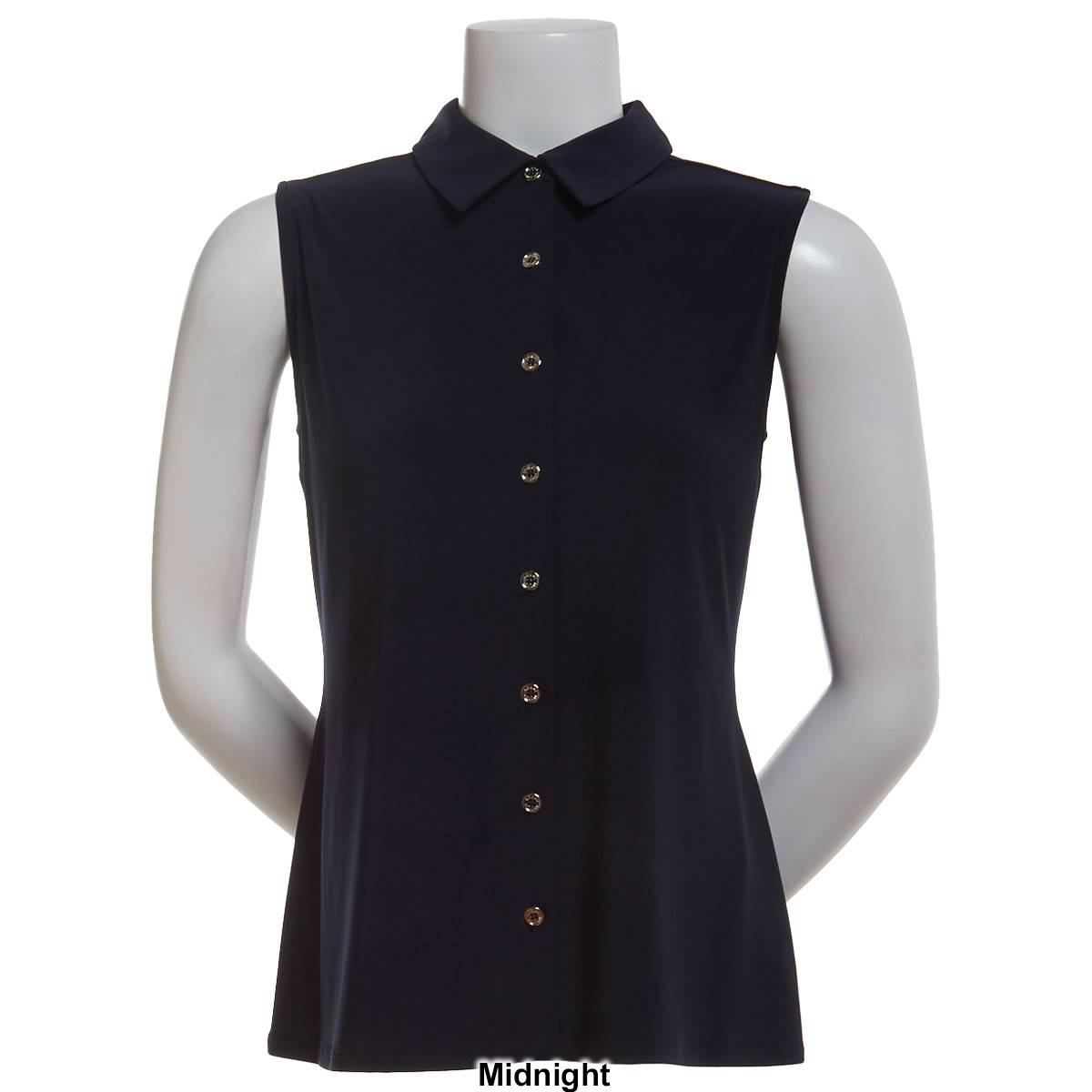 This Womens Tommy Hilfiger sleeveless button front knit blouse is an elegant essential. This sleek top provides a solid hue and a spread collar.