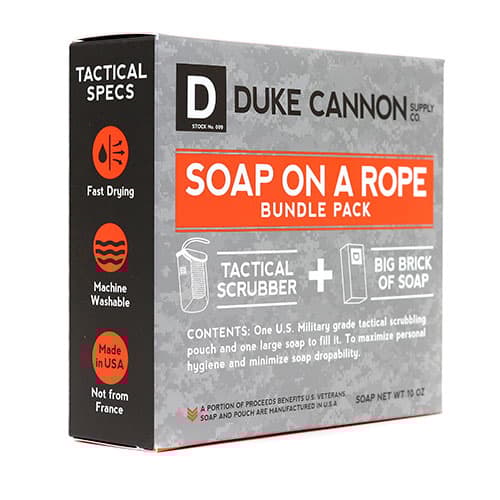 The contents of this box should be standard-issue equipment for any shower. Includes Duke Cannon Big Brick of Soap- Smells like Productivity, to go inside a military-grade tactical scrubber made of coarse mesh to protect your hands and feet and a softer mesh for personal sanitation. The 550 mll-spec paracord keeps your soap off the ground. perfect for home, outdoor, field, or just about anywhere.