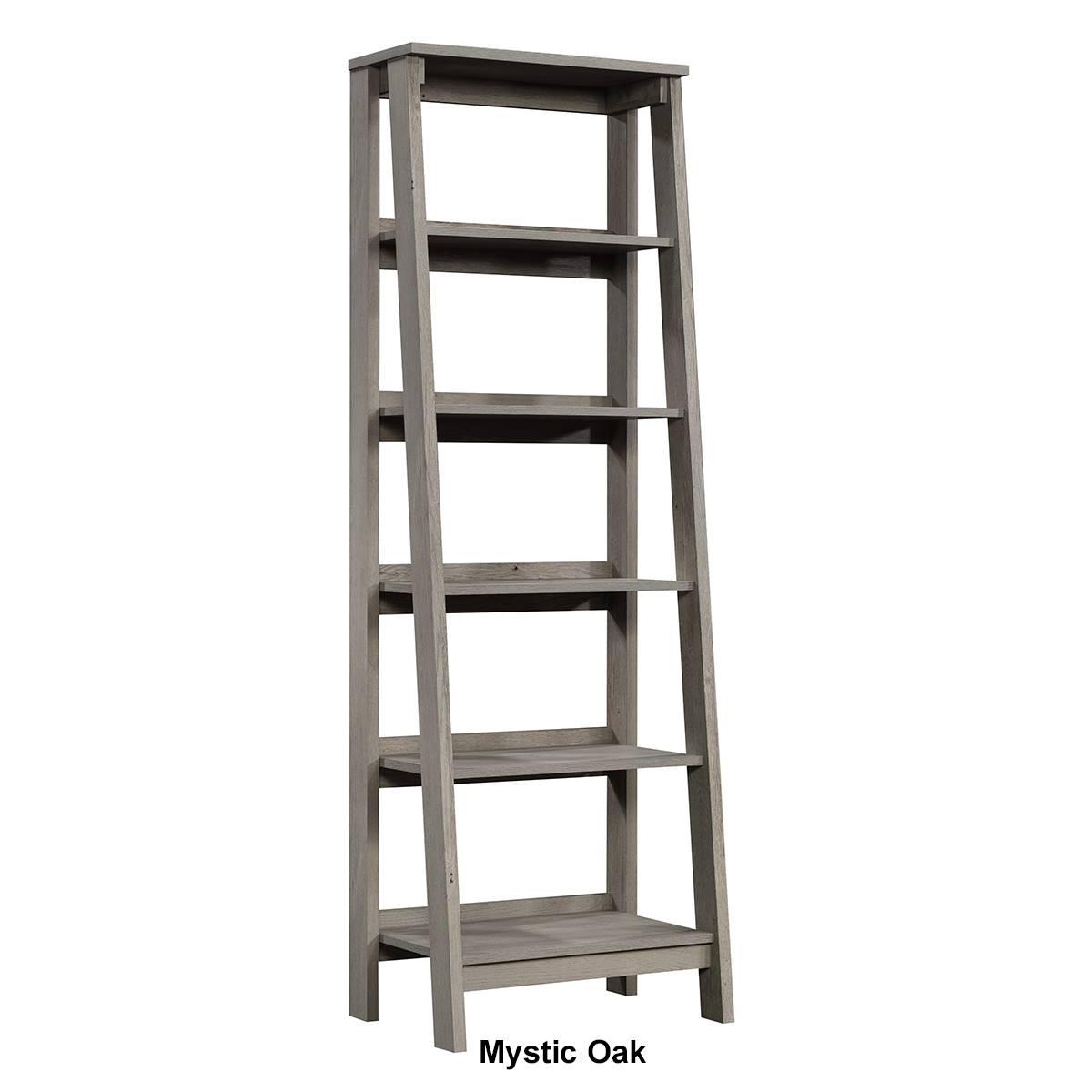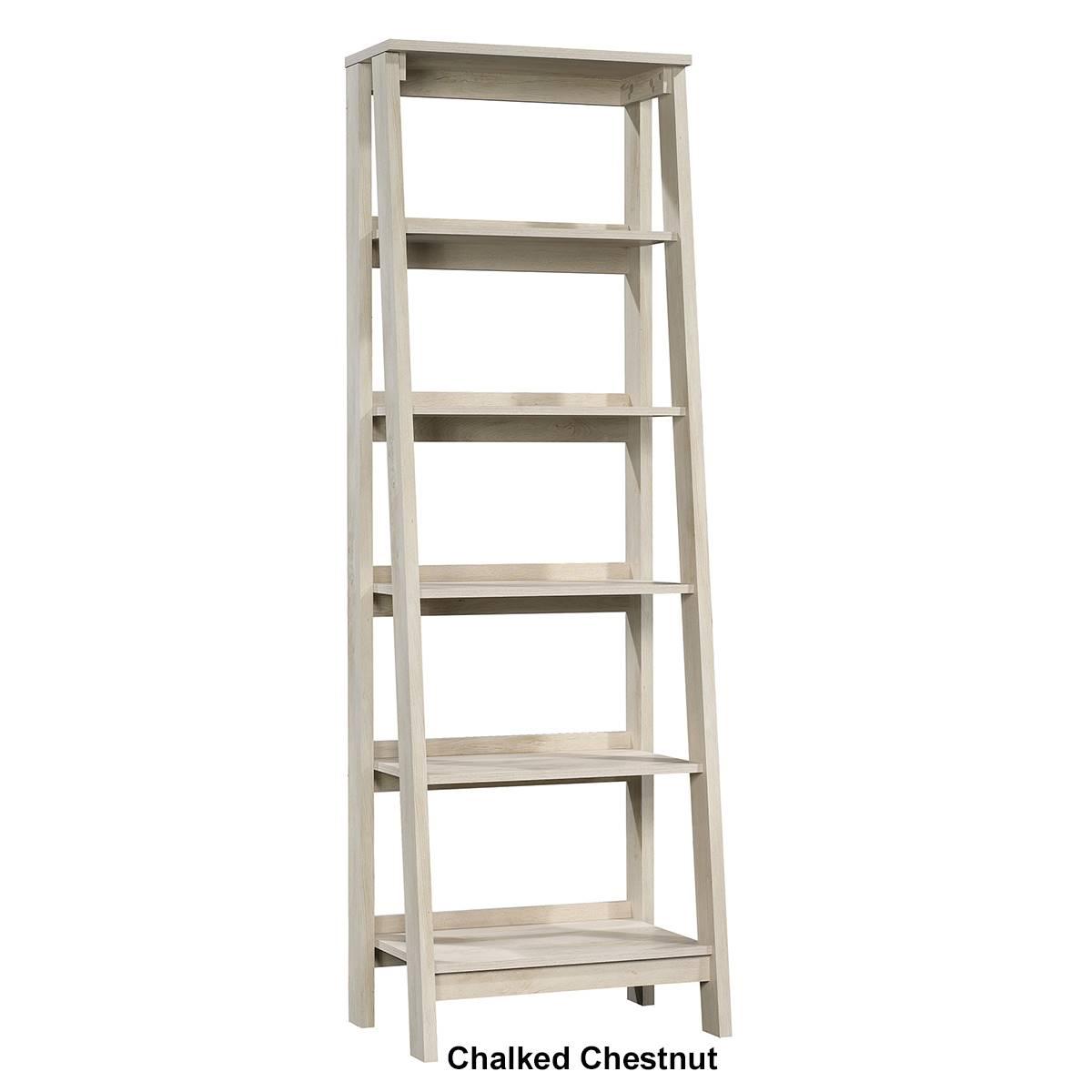 Sauder Trestle 5 shelf bookcase with Chalked Chestnut finish. Five open storage shelves for your favorite home décor. Finished on all sides.