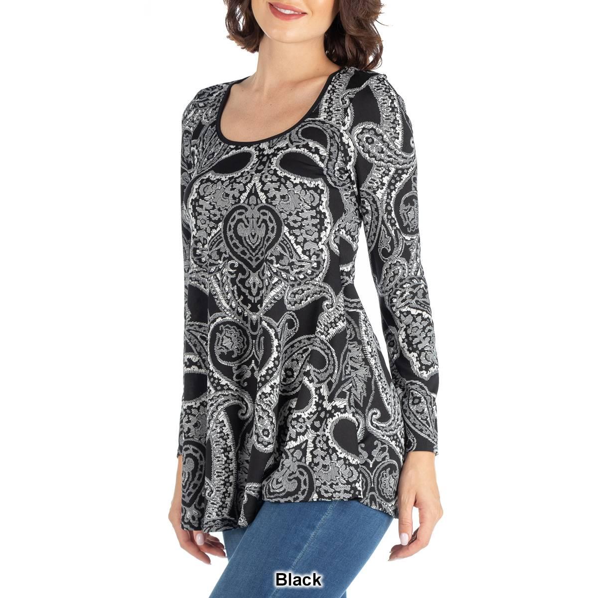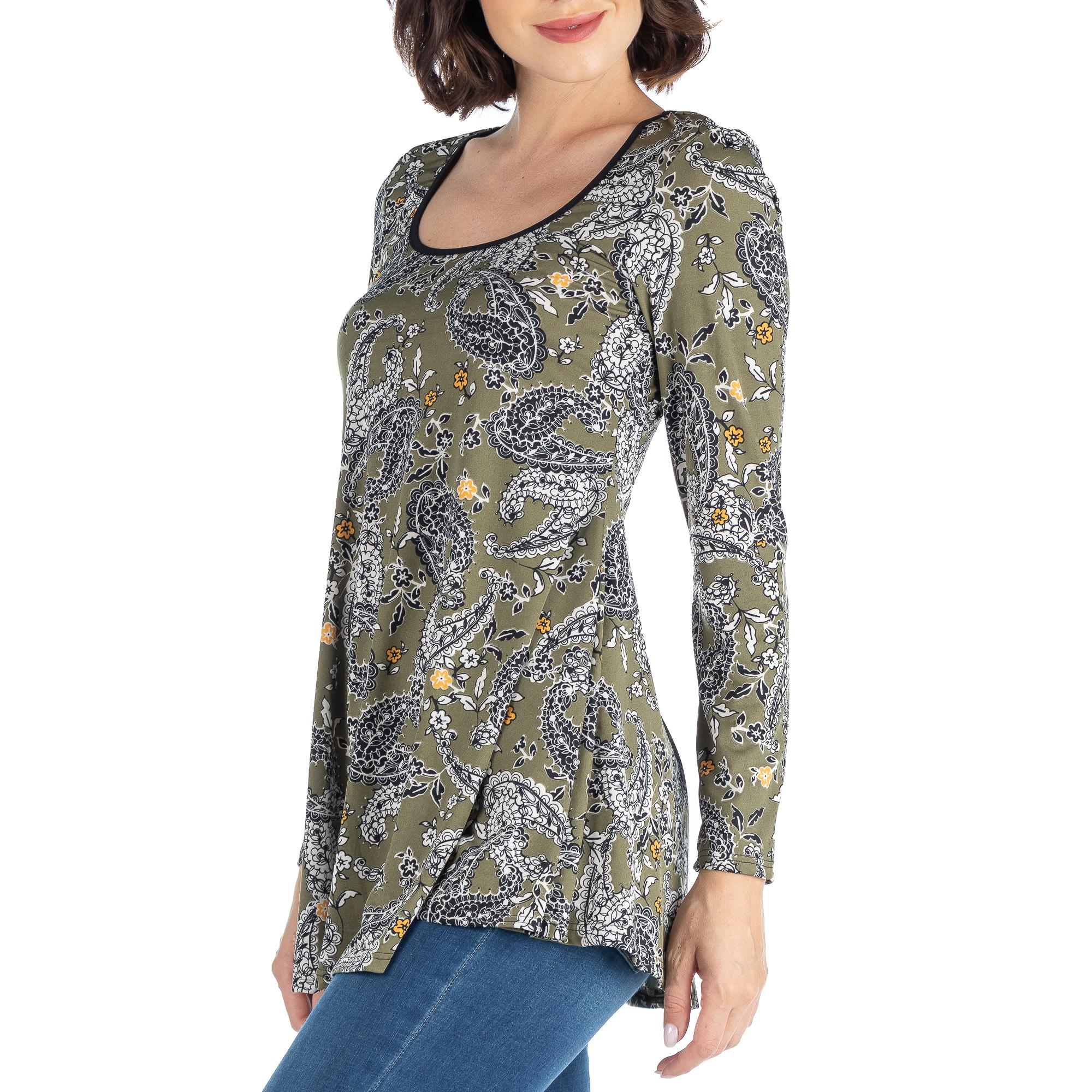 Description This Womens 24/7 Comfort Apparel long sleeve paisley tunic is a great year-round style. Featuring a scoop neckline, long sleeves, and flattering flared fit and added...