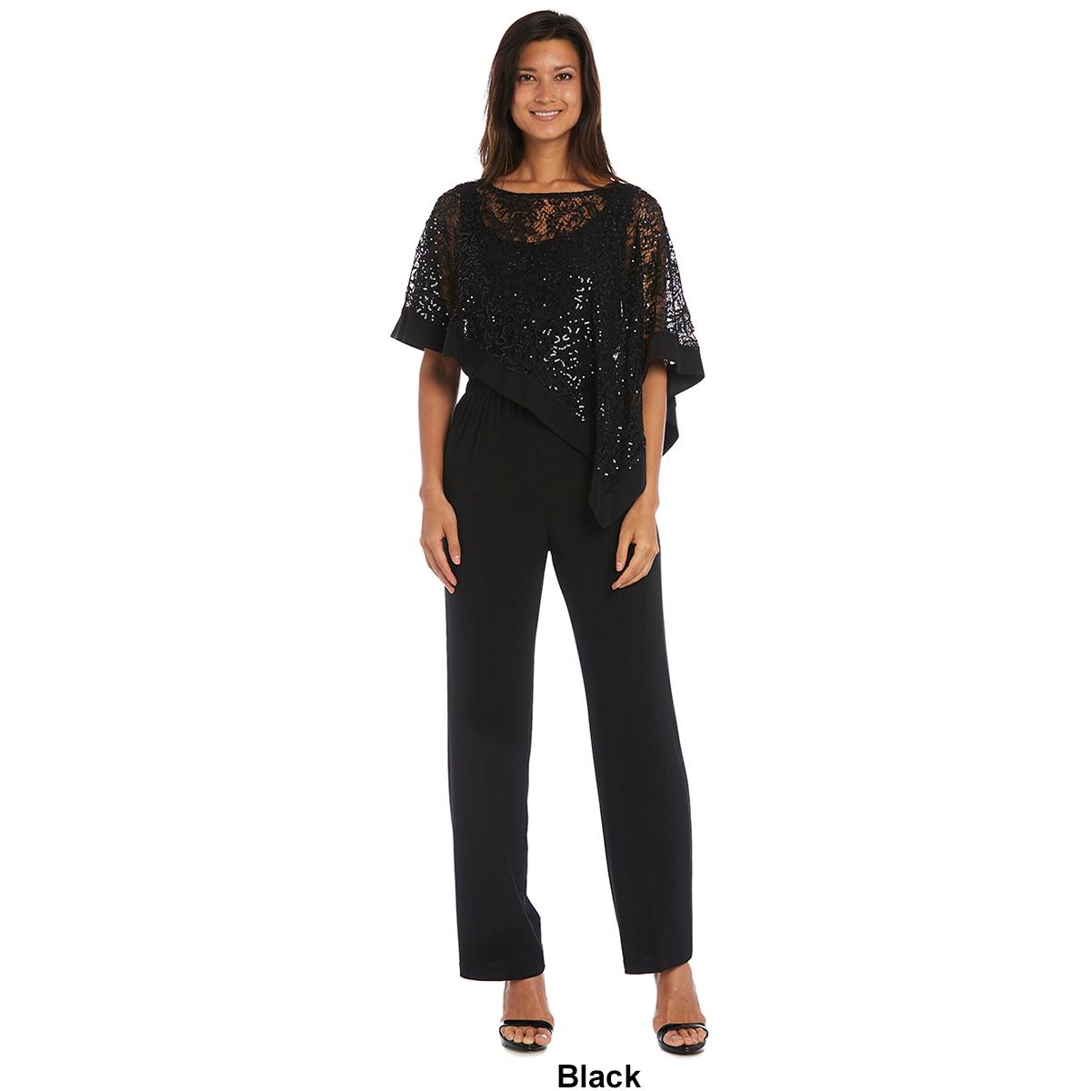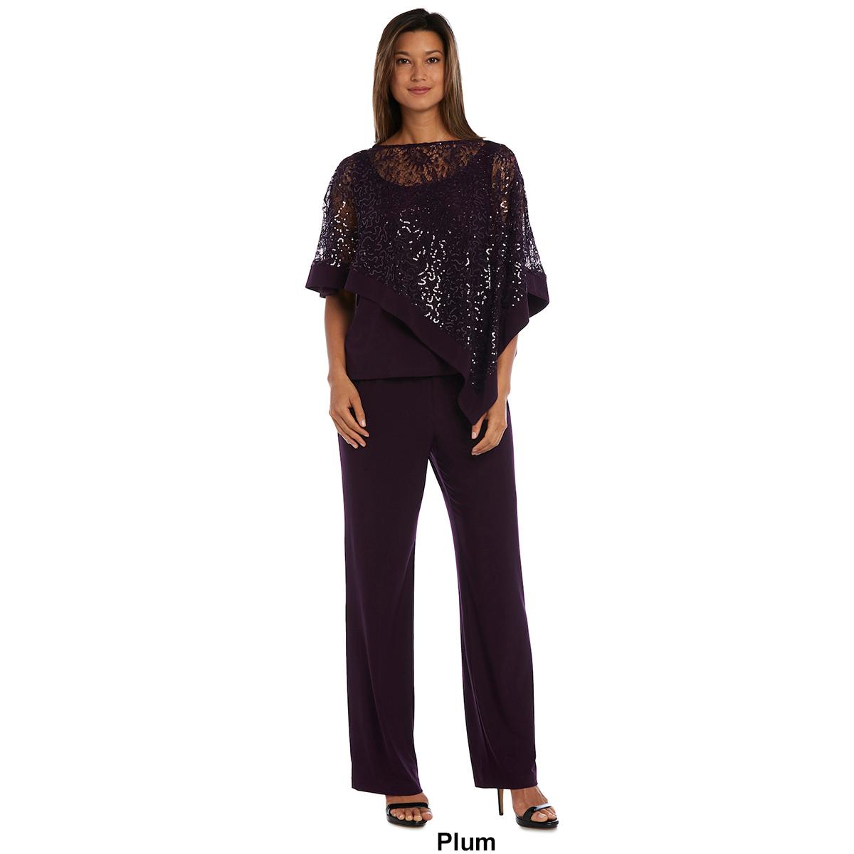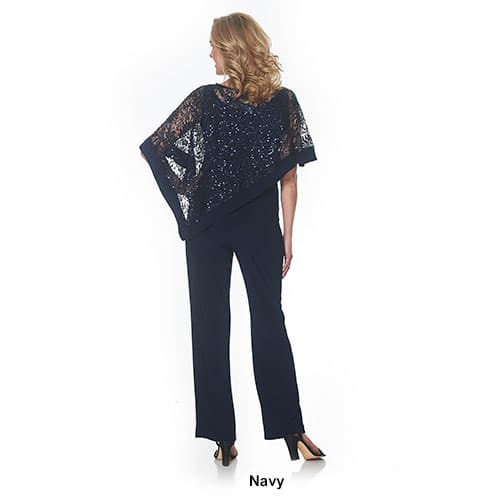 Description Doll yourself up in this delicate Womens R&M Richards solid pants suit with a gleaming sequin embellished lace popover poncho. The classy design offers a tank...
