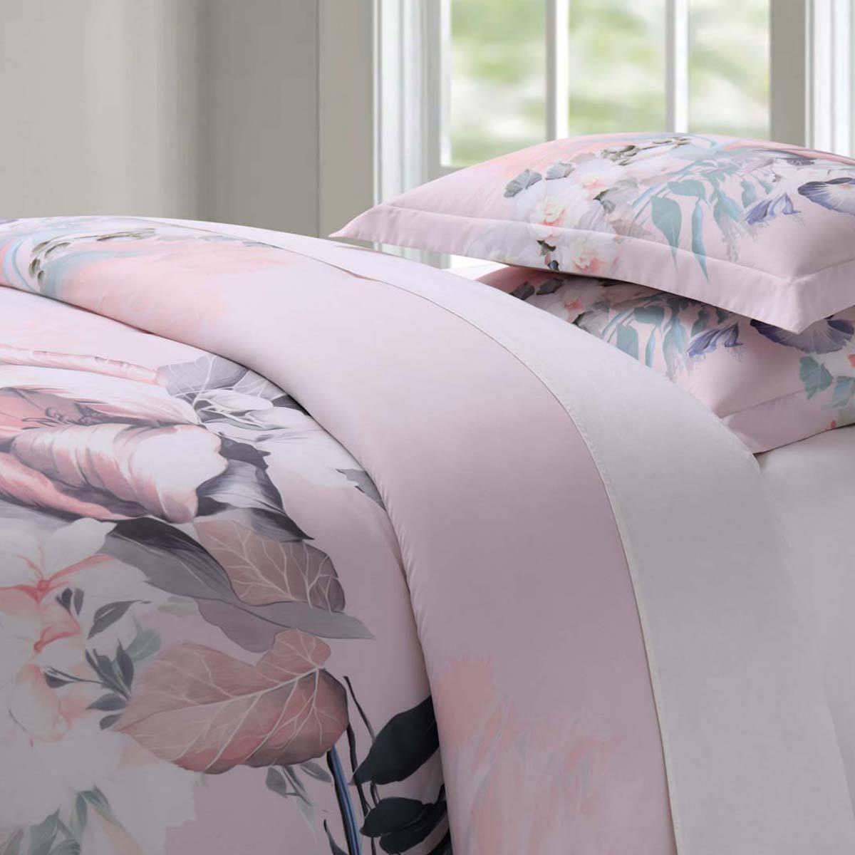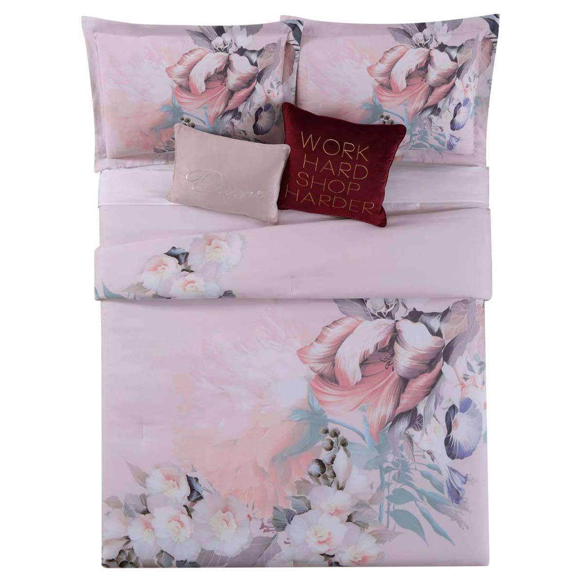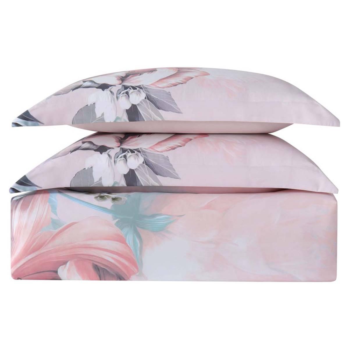 This Christian Siriano New York® dreamy floral duvet cover set will make a lovely addition to your bedroom décor. The design showcases a large scale floral print pattern in soft shades of rose, blue and grey on a cream background.