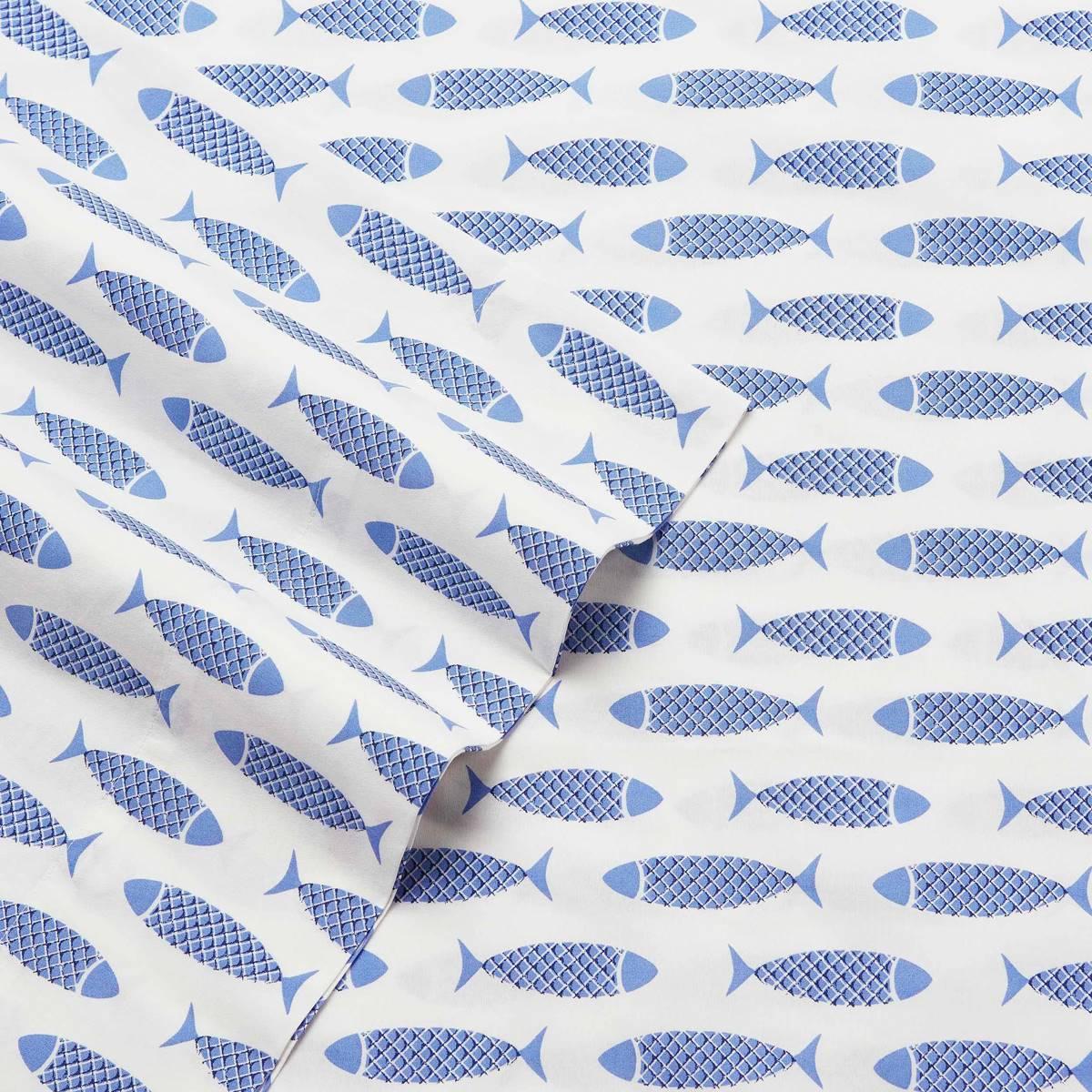 Description This Nautica Woodblock Fish sheet set features a decorative motif in fresh blues against a crisp white ground. Cotton percale sheeting truly inspires coastal living....