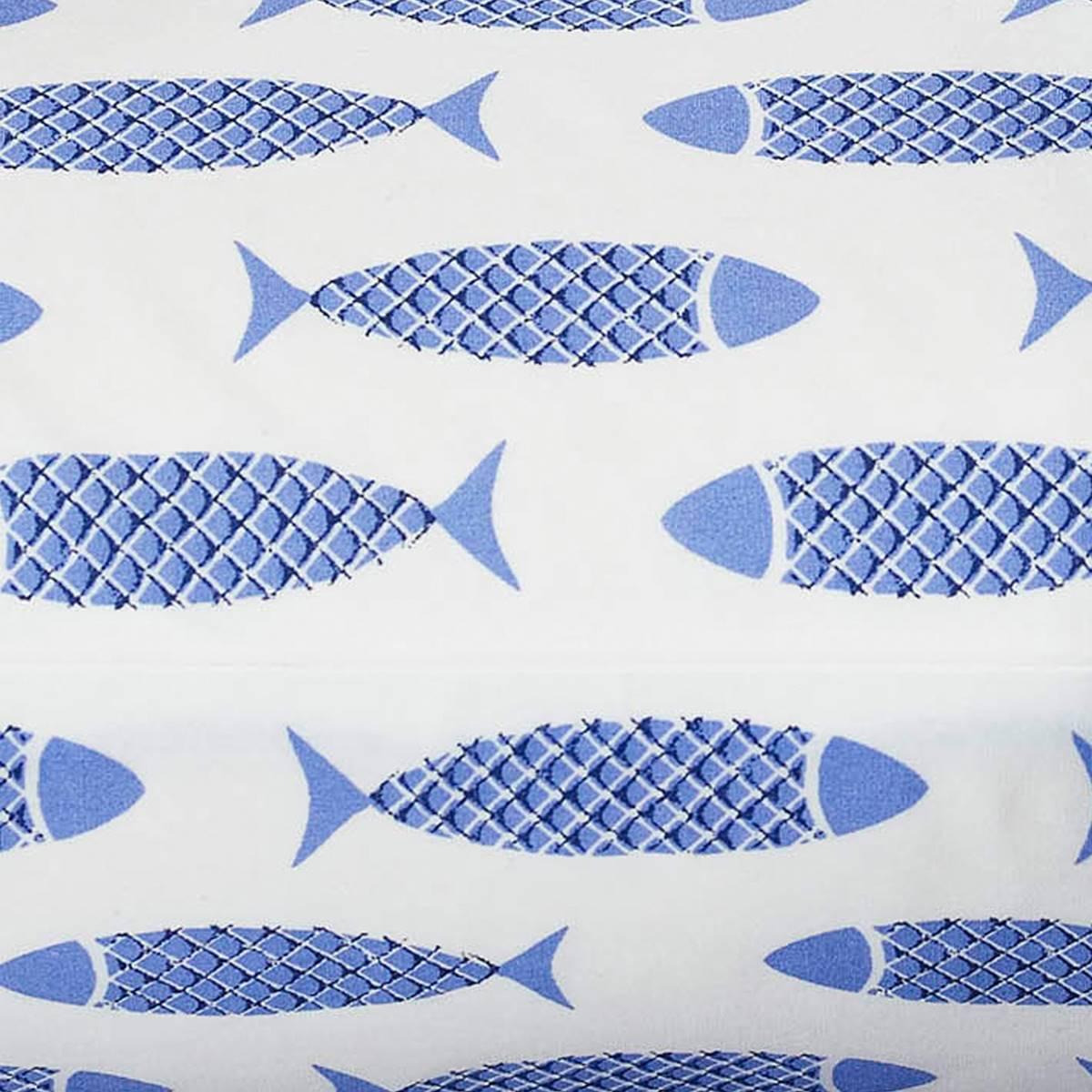 This Nautica Woodblock Fish sheet set features a decorative motif in fresh blues against a crisp white ground. Cotton percale sheeting truly inspires coastal living. Fitted sheet has elastic on all sides to ensure a better fit and prevents slipping on the mattress.