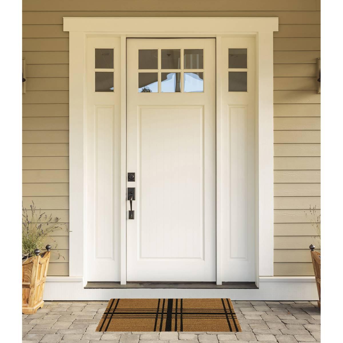 The Design Imports farmhouse plaid doormat is crafted of 100% natural coconut coir fiber that provides an excellent shoe scrapping surface for brushing dirt, slush, and mud off shoes and boots. The backing is phthalate-free PVC. This mat enhances the look of any style entry way and is a perfect housewarming gift.