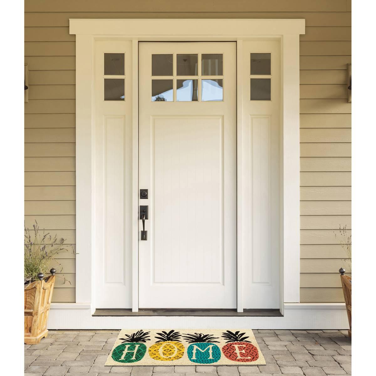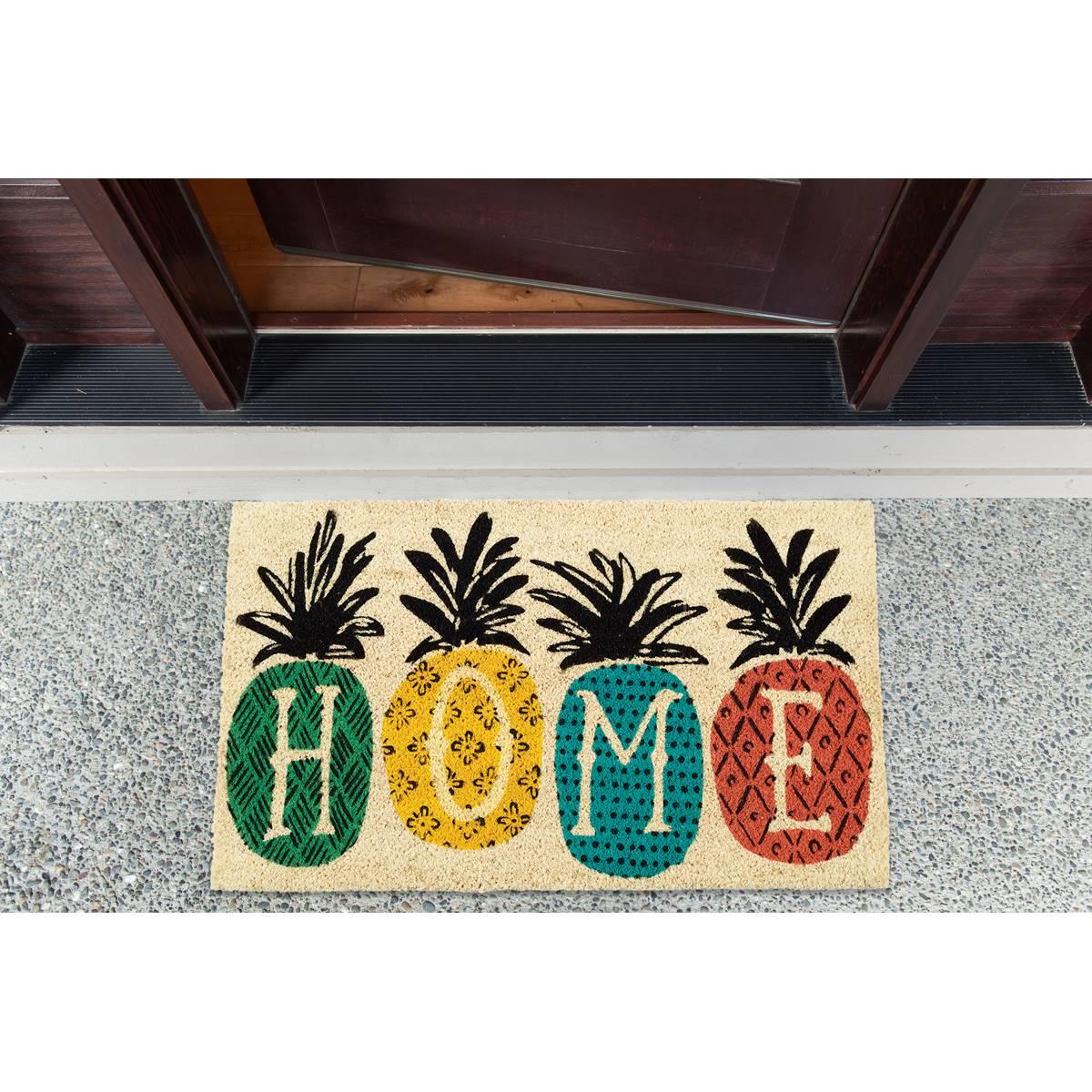 Greet your guests with the Design Imports pineapple home natural coir doormat with a non-slip back. Created of 100% coir fiber extracted from coconut husk, an all-natural material known for its scrubbing power that is also incredibly strong and abrasion-resistant, it will remove even the toughest dirt and debris from shoes. The coir fibers easily capture moisture, dirt, and other particles from shoes before they enter your home. The non-slip PVC backing keeps the mat in place and does not allow water, dirt, and debris to pass through. Use in covered outdoor entry ways.