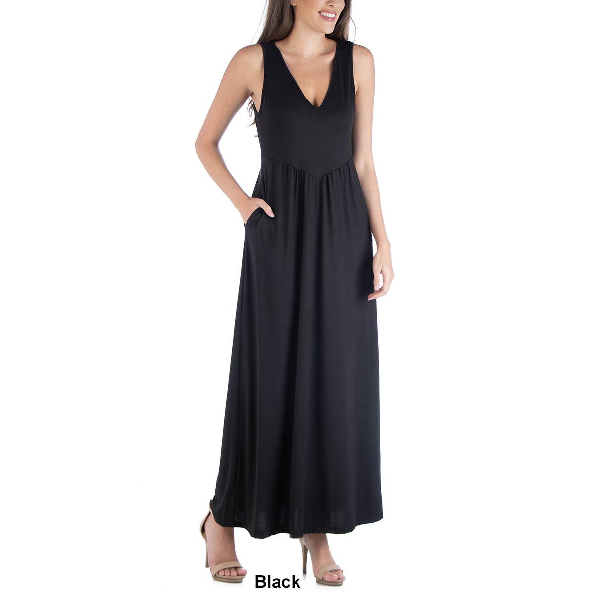 Description This Womens 24/7 Comfort Apparel sleeveless v-neck maxi pleated dress is both beautiful and practical with the addition of pockets. It features a sleeveless slim fit...