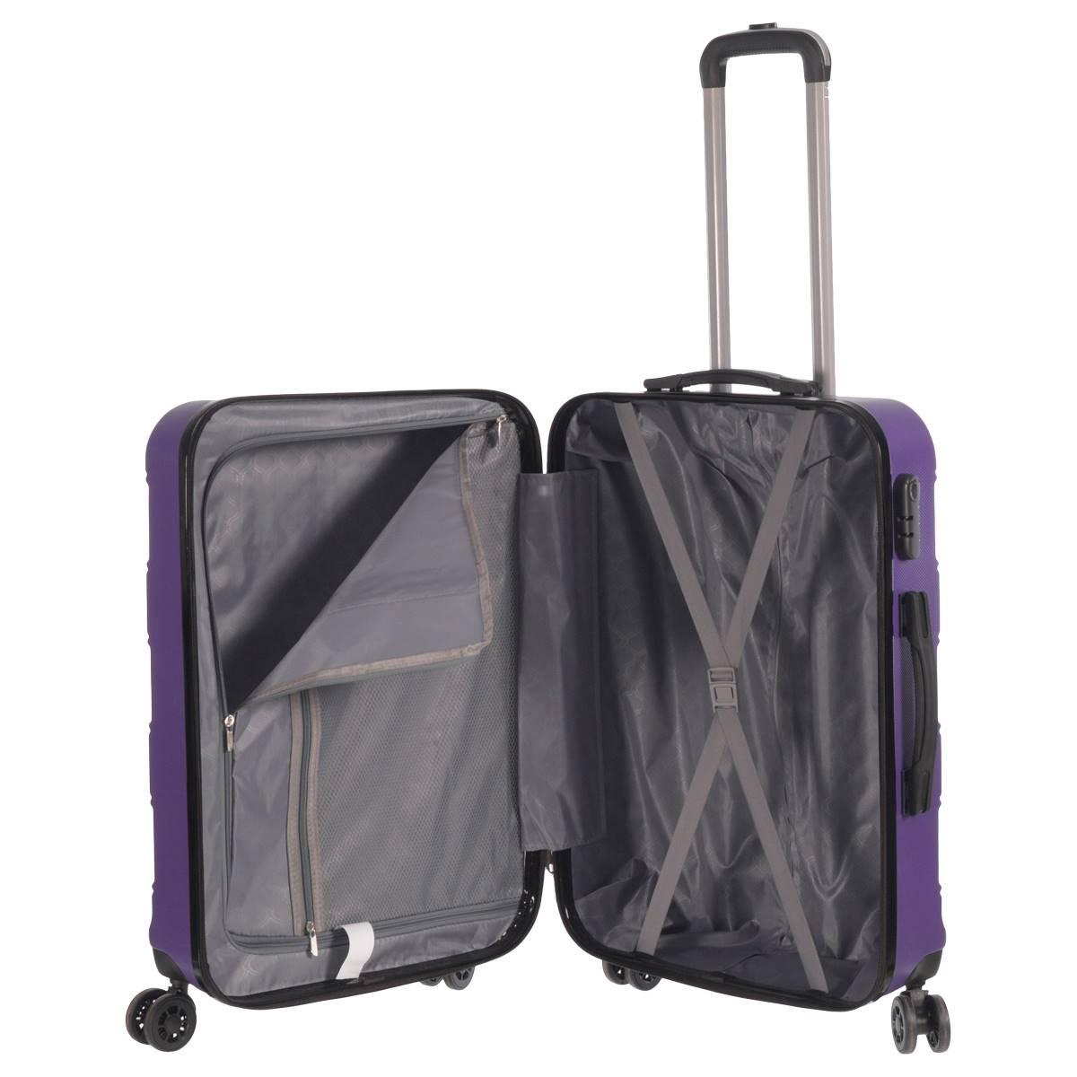 Enjoy your travels with the Club Rochelier Deco hardside 24-inch spinner luggage case. The durable, waterproof and lightweight ABS hard outer shell guarantees the safety of your belongings. The adjustable 2-level locking telescoping handle adjusts comfortably to any size traveler and the 4 rotating wheel system allows for smooth-rolling mobility. Convenient top and side carry handles for easy grip and easy lifting. Protective side feet allow you to stand the case on its side without damage. Club Rochelier branded fully lined polyester interior features elastic cross-straps on one side to keep your clothing in place and expands an extra 20 inches.