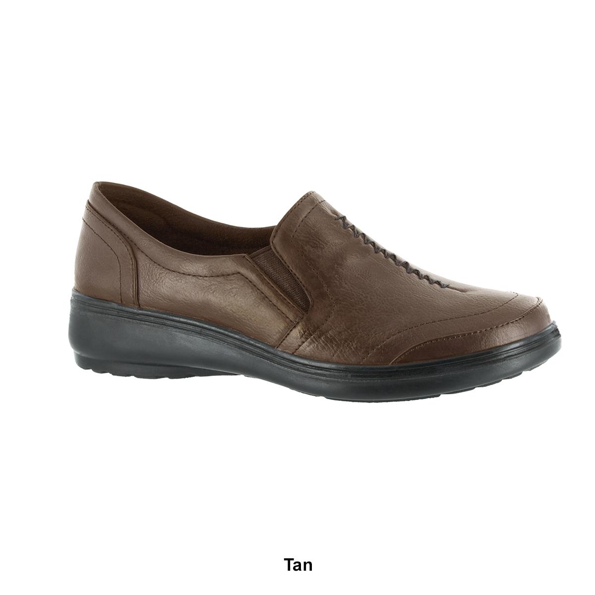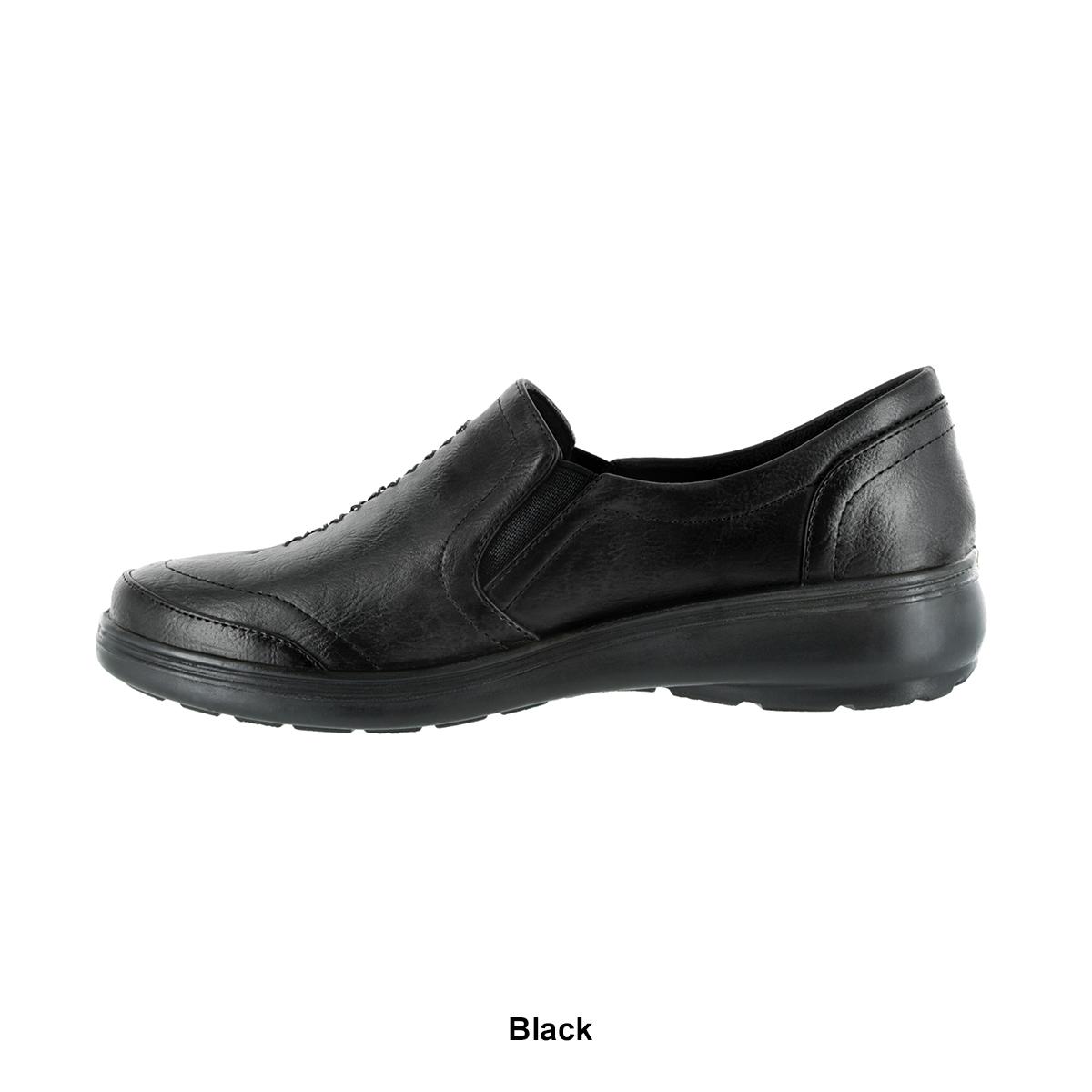 Take on the workday in the Womens Easy Street Ultimate slip-on comfort loafers. A round-toe silhouette offers an everyday styling with features that include exposed seaming and stretch goring.