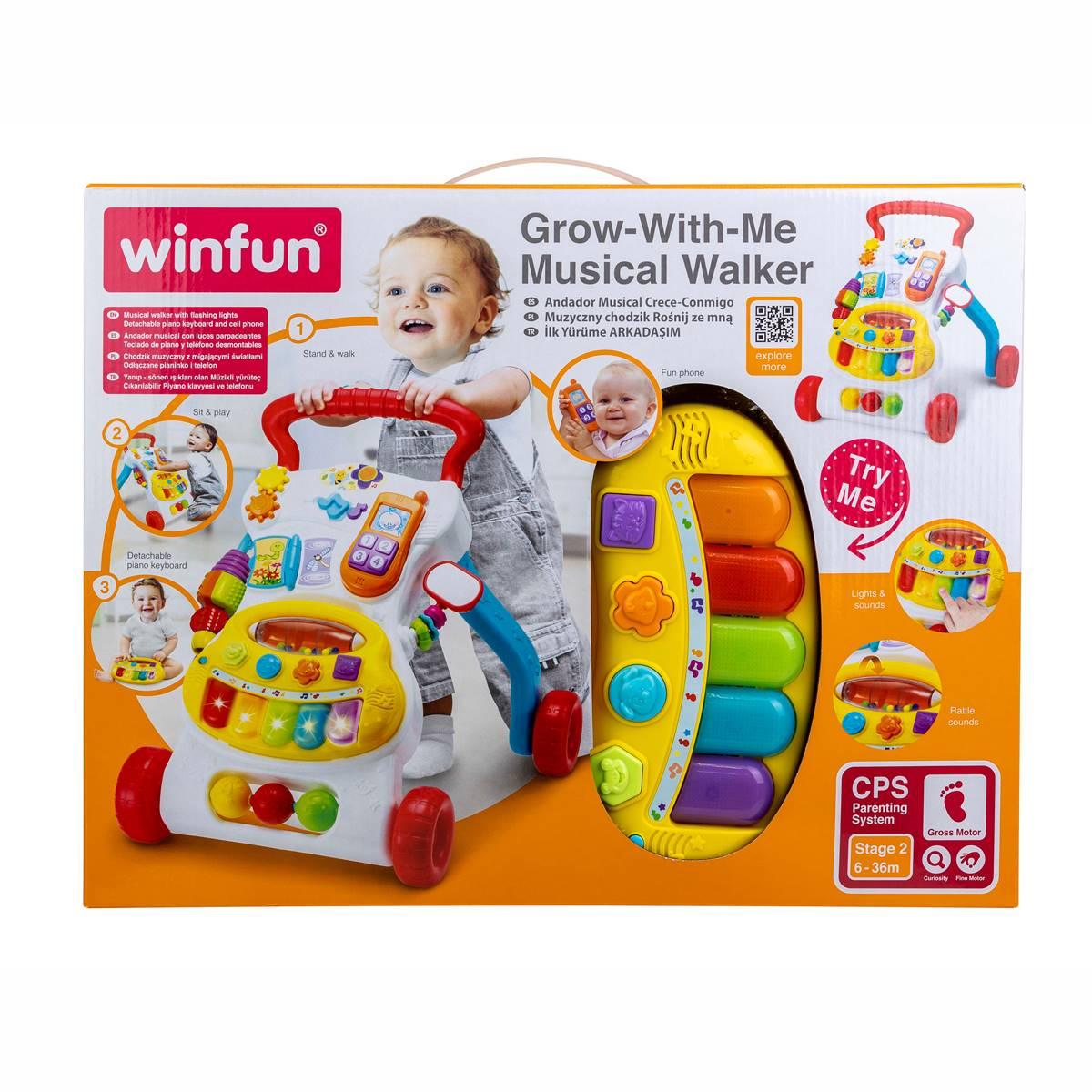 WinFun Grow With Me Musical Walker has flashing lights and fun melodies along with different sound effects. It helps with body balance as a stand and push walker or a sit and play toy. Very bright and colorful with animal sounds, this walker also features lockable wheels, detachable phone, and keyboard.