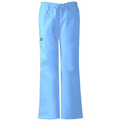 Womens Cherokee utility pants with a contemporary fit; two cargo-style front pockets; a D ring on left pocket; extra cargo and scissor pocket. Leg seaming detail at knee; 5 belt loops and triple needle top stitching.