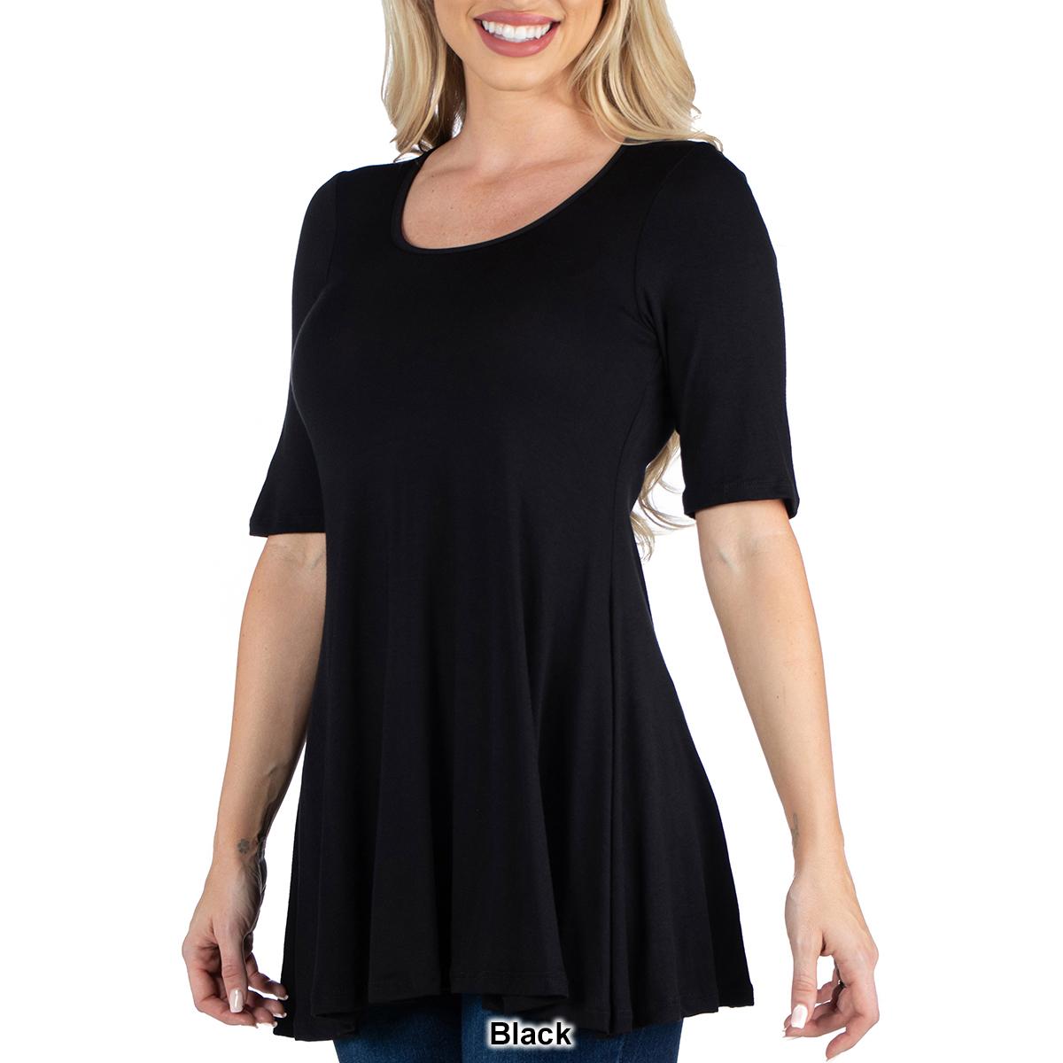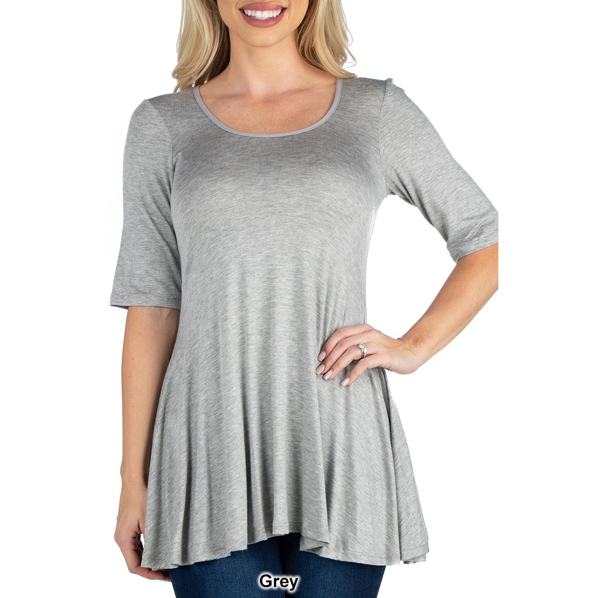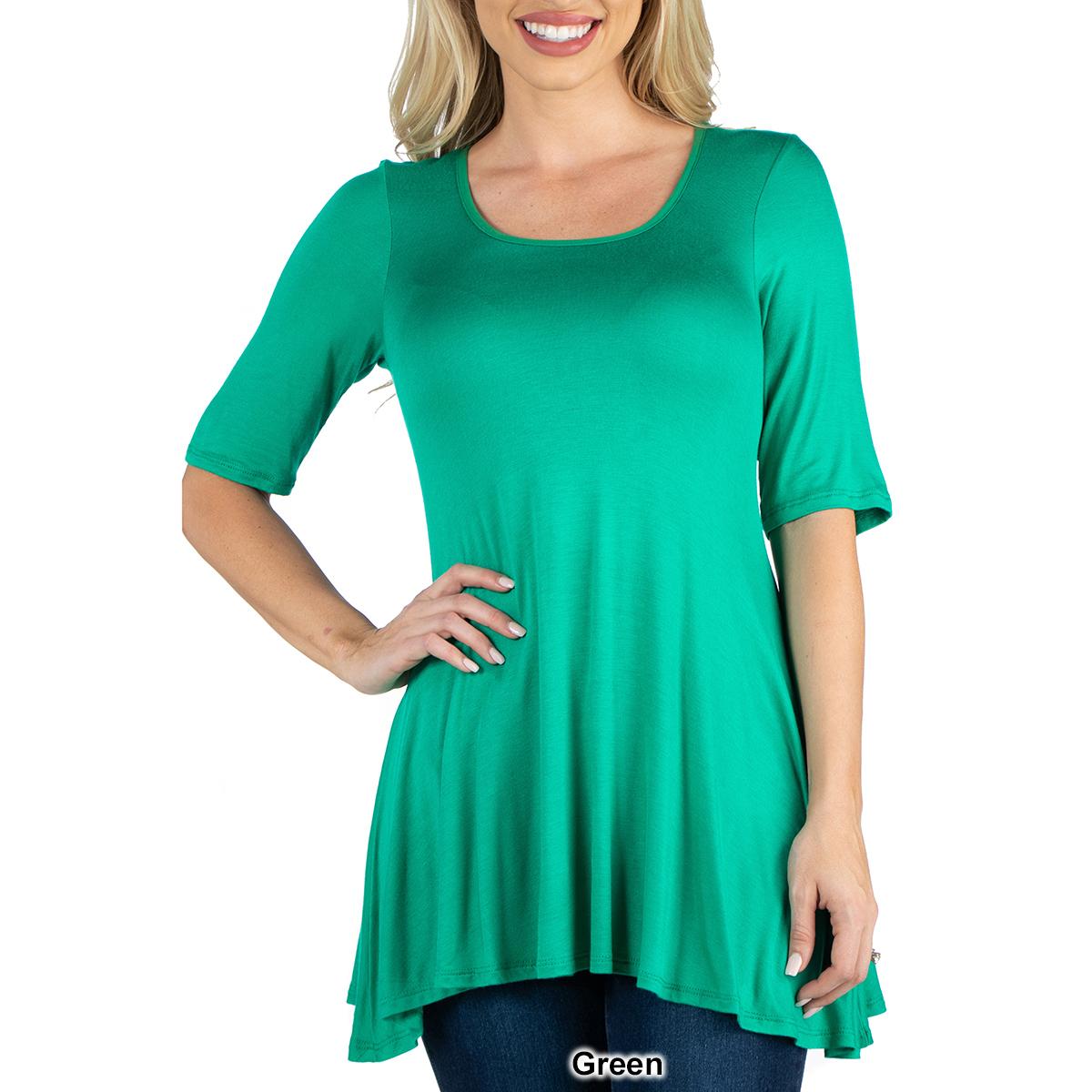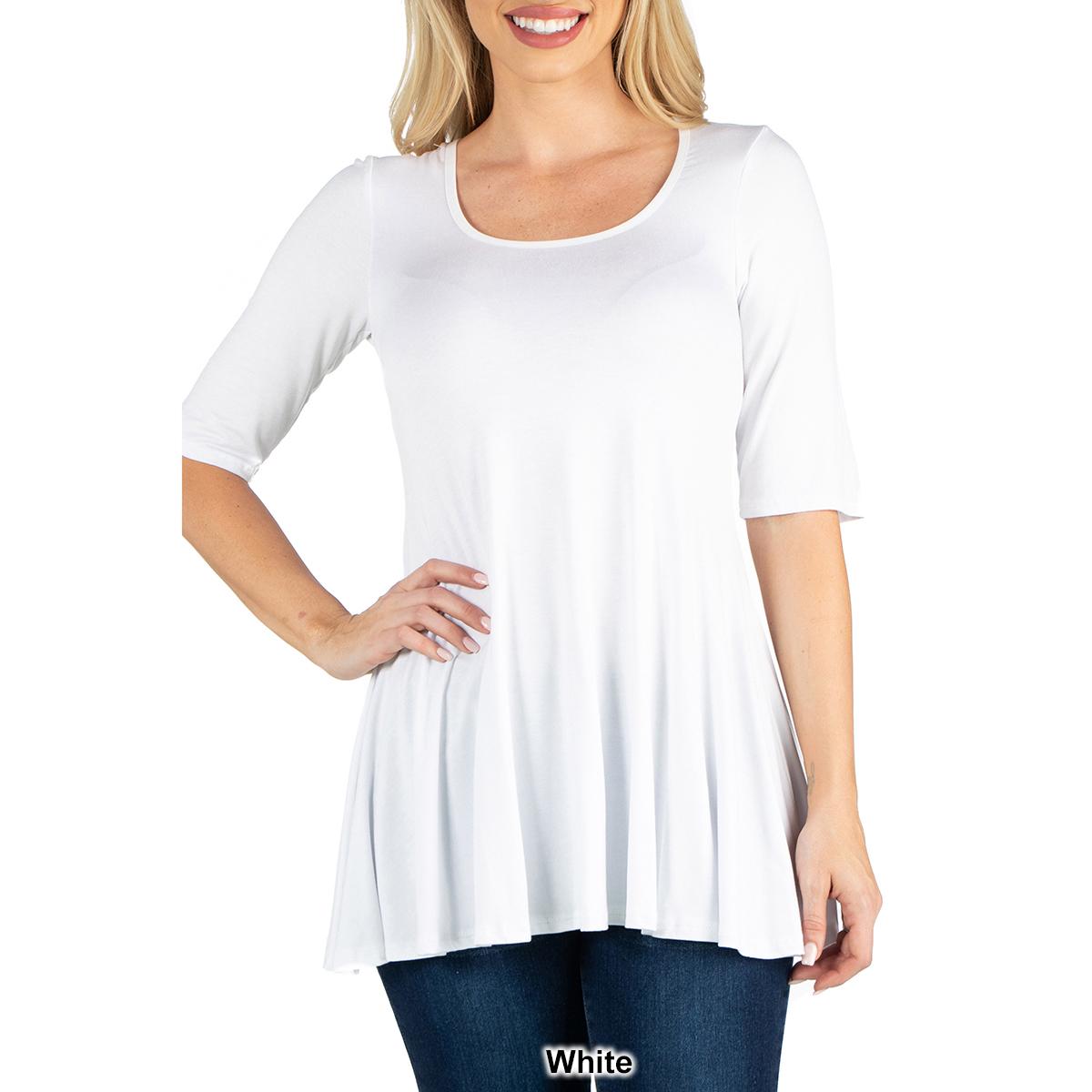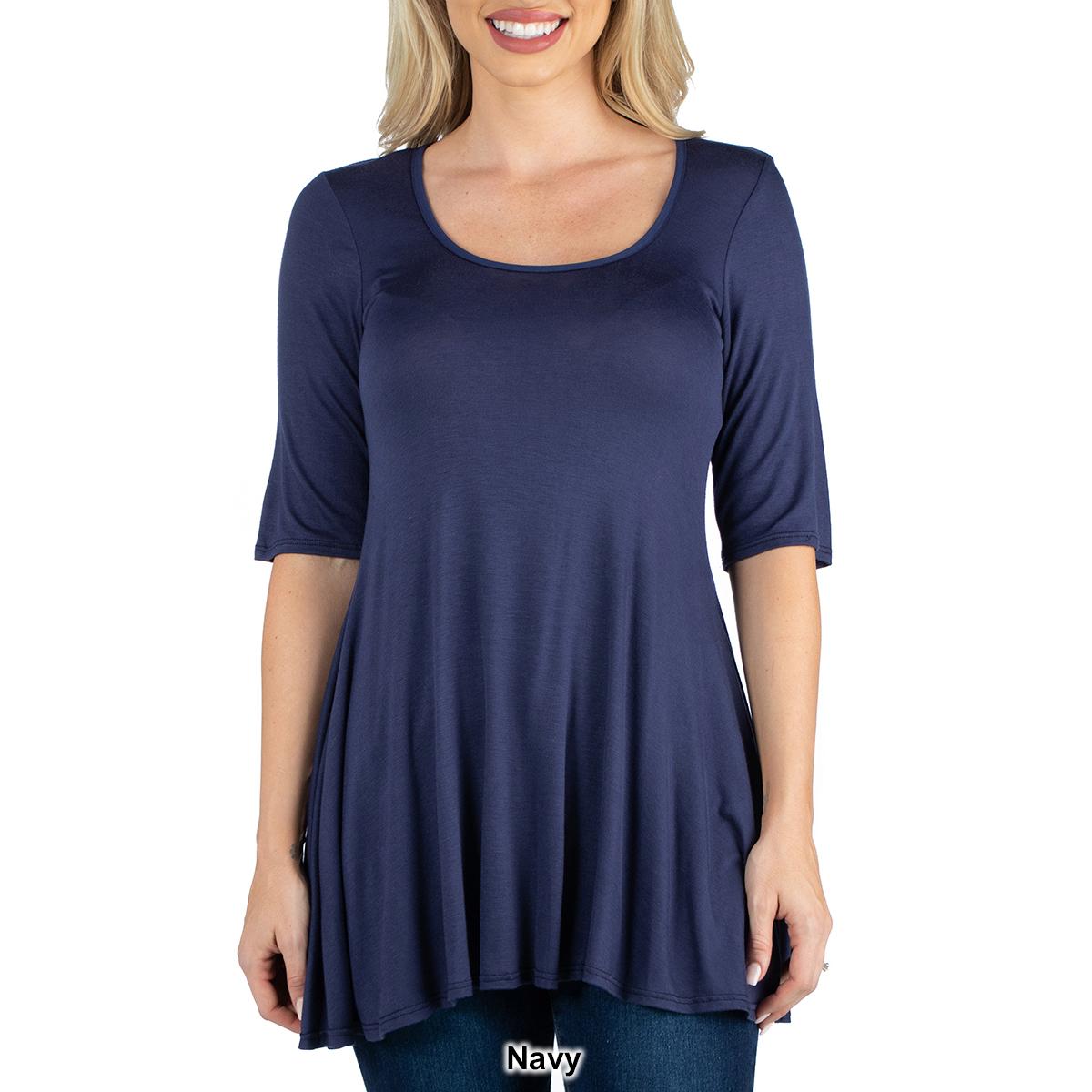 Description This Womens 24/7 Comfort Apparel stylish solid colored tunic features a figure-flattering design. The elbow length sleeves, round neckline, and swing top shape make...