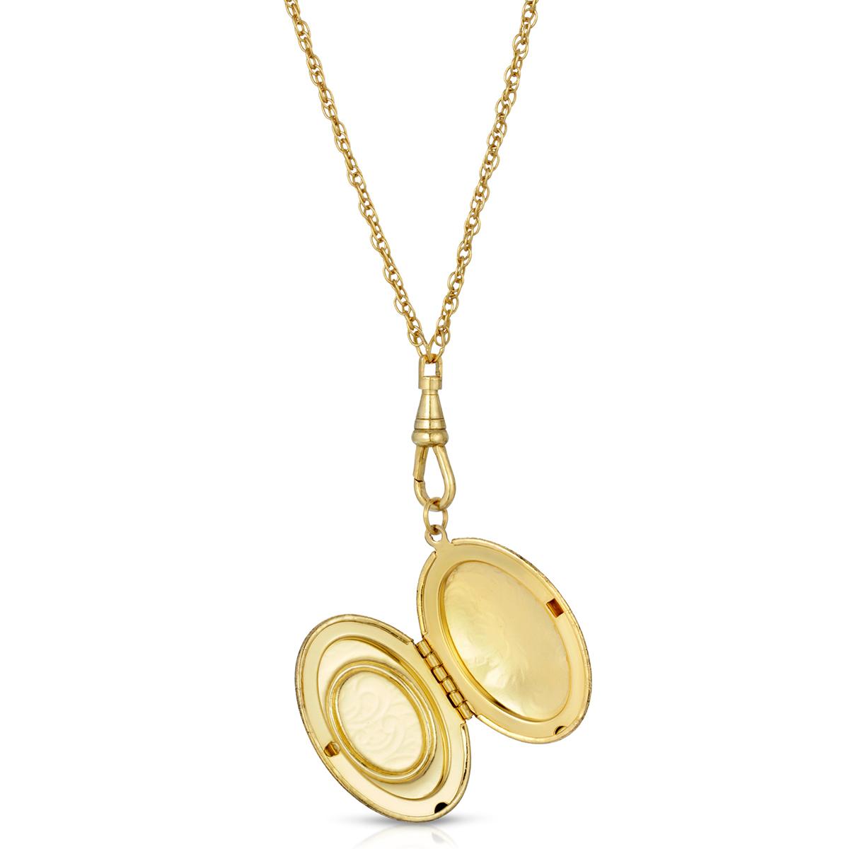 A style popularized by Queen Victoria, this 1928 timeless vintage-inspired double locket necklace features a simulated carnelian and ivory color cameo set on an etched gold tone frame. The twenty-eight-inch gold tone necklace adds a beautiful vintage feel to any ensemble.