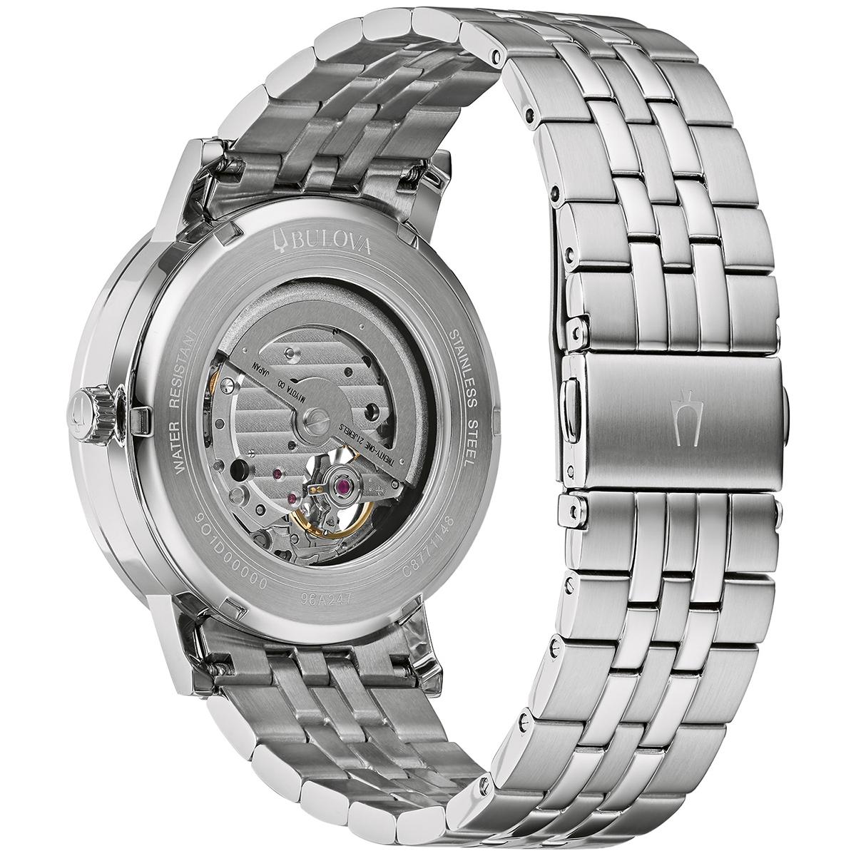 The Mens Bulova Automatic Stainless Blue Dial Bracelet Watch has a blue dial with exhibition case back offering a glimpse of the 21-jewel automatic heartbeat movement with a 42-hour power reserve. The dial features stainless steel hands and markers and a sub sweep dial.