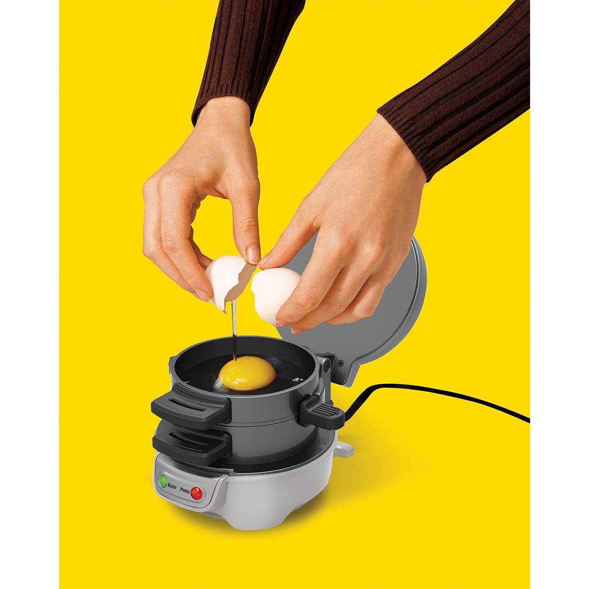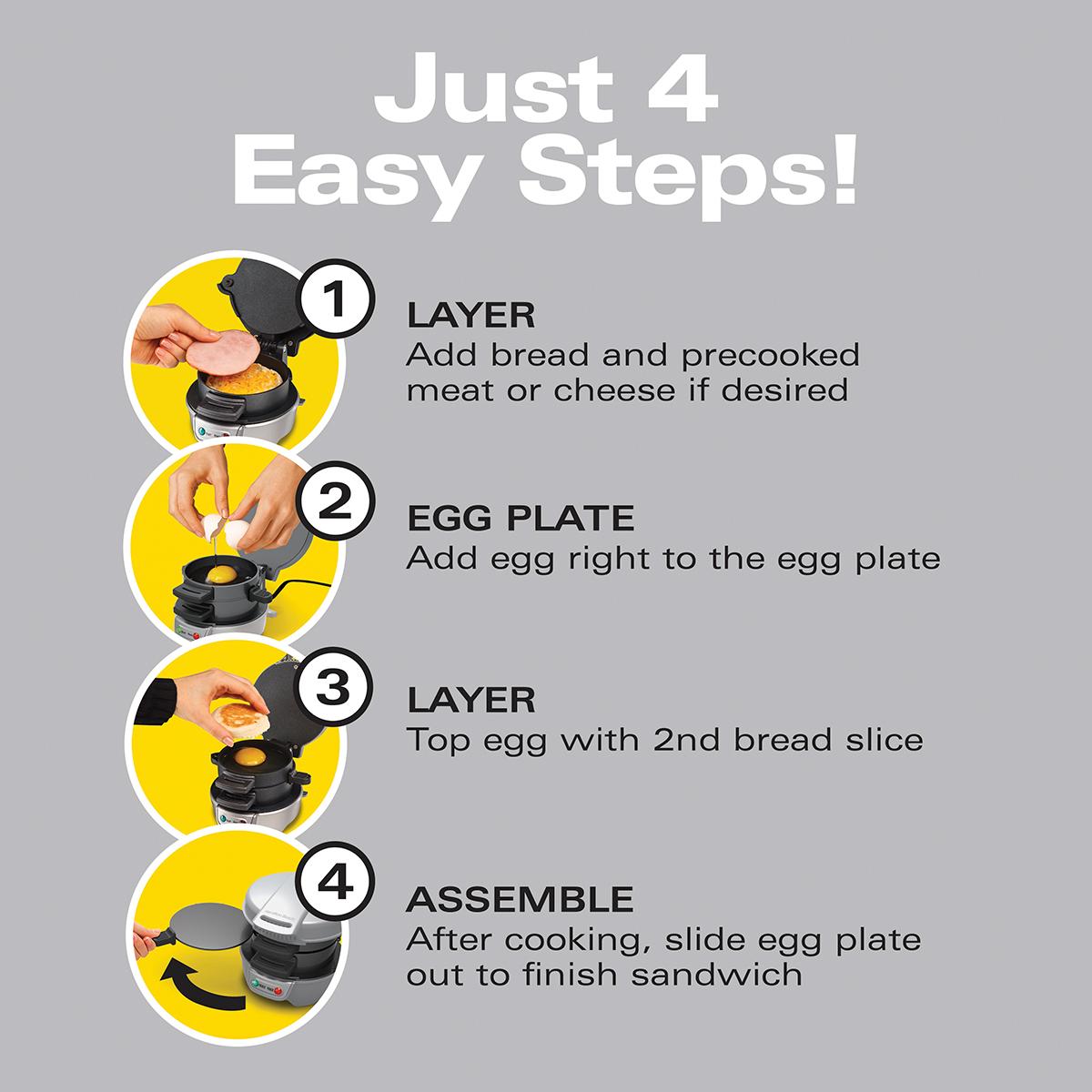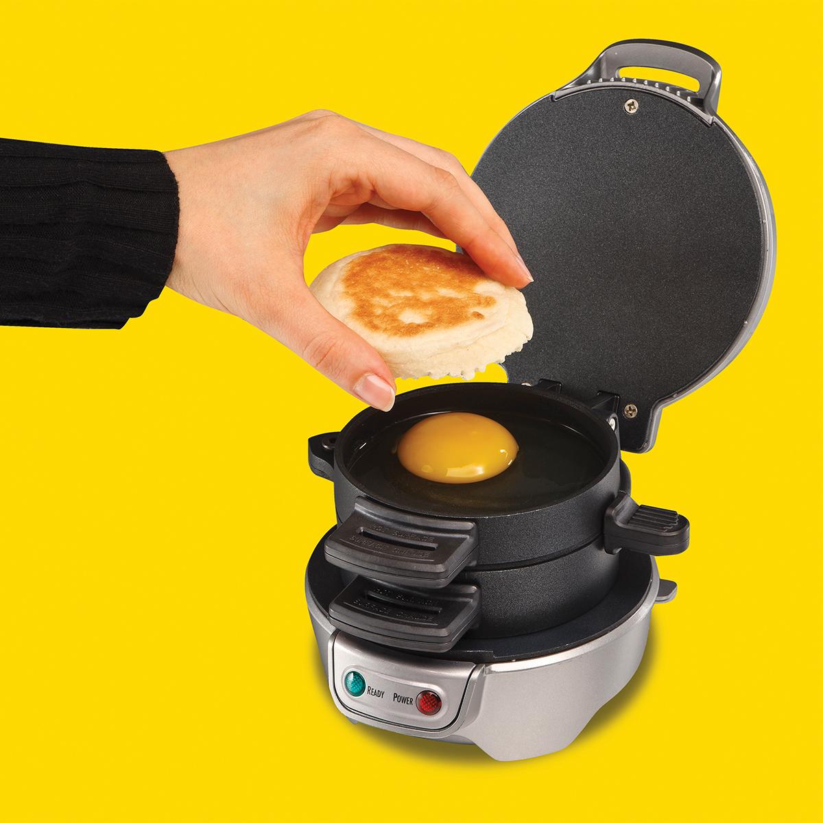 Hamilton Beach® Breakfast Sandwich Maker. Quick layered approach to cooking a breakfast sandwich. First layer toasts bottom, second layer cooks egg and third layer toasts top of bread.