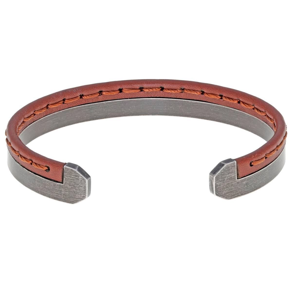 Strips of brown leather and stainless steel go side by side together to craft this impressive Mens Lynx stitched cuff bangle bracelet with black ion-plated accents that complete the look.
