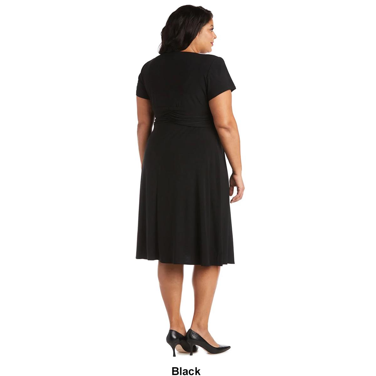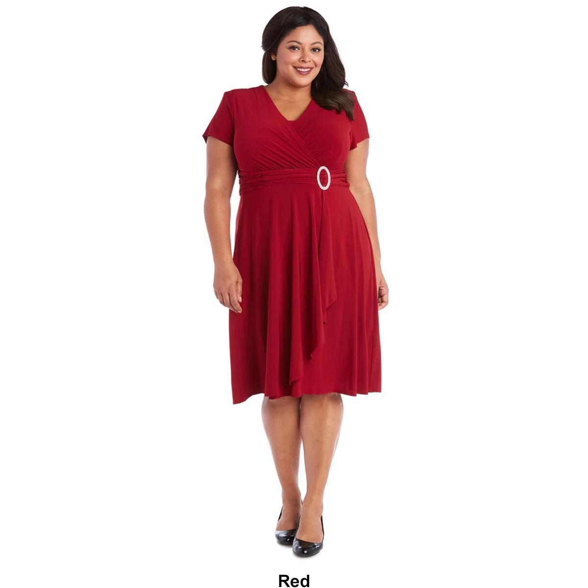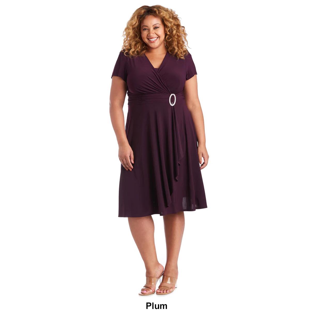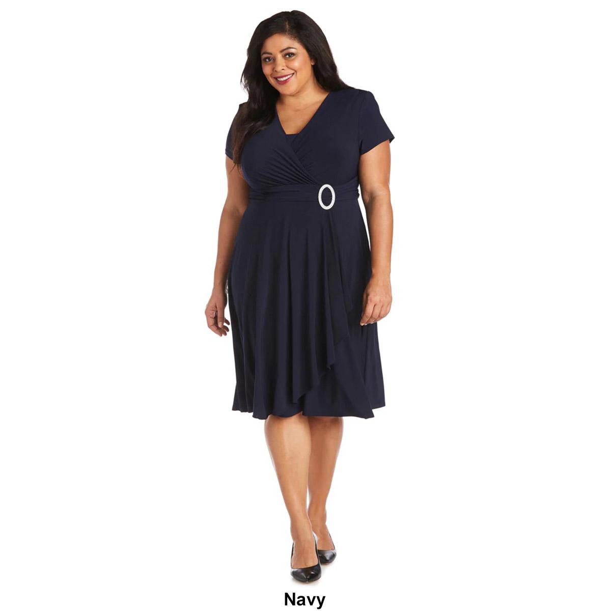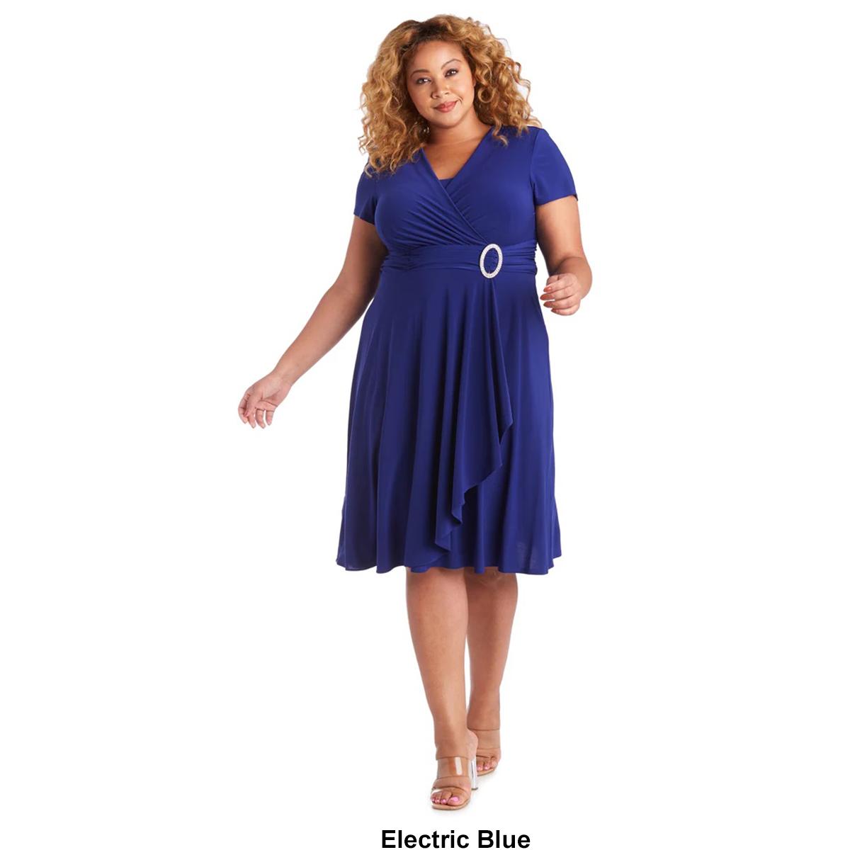 This Plus Size R&M Richards a-line dress will have you looking and feeling your best Features short sleeves, a surplice neckline, built-in shoulder pads, and a rhinestone detailed, side ruched waist.
