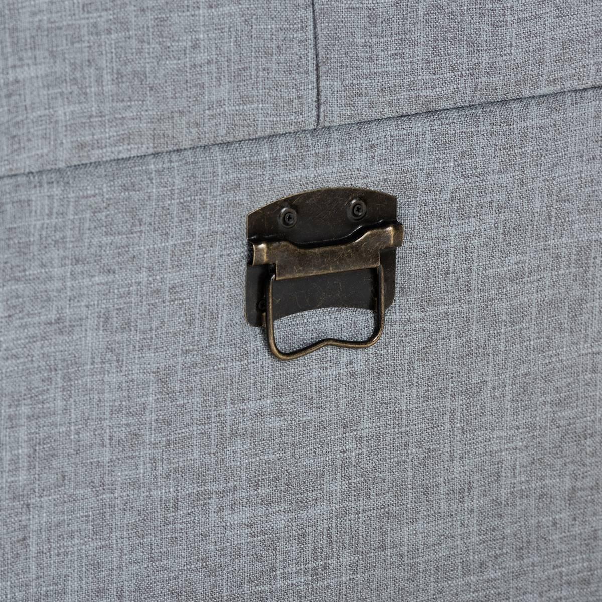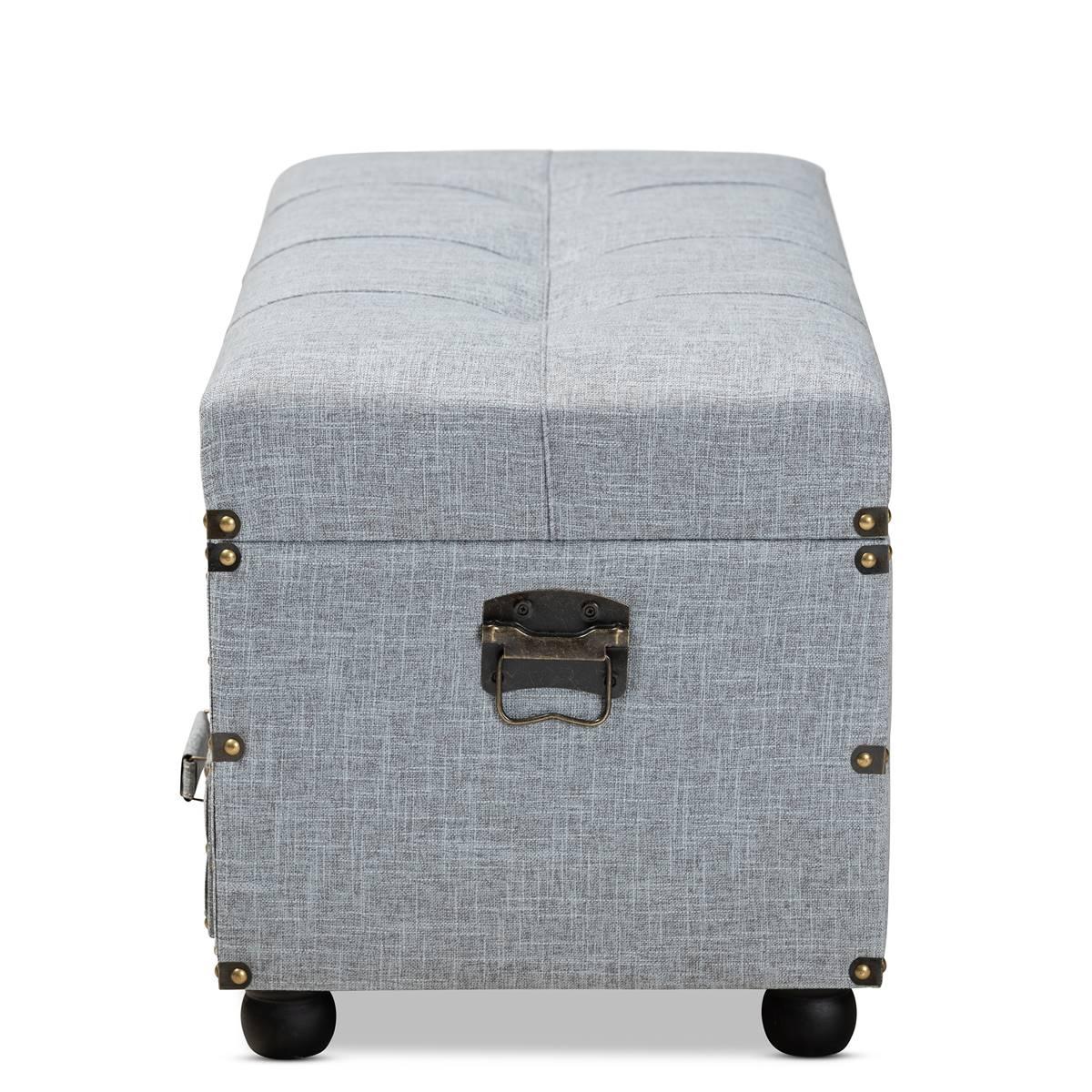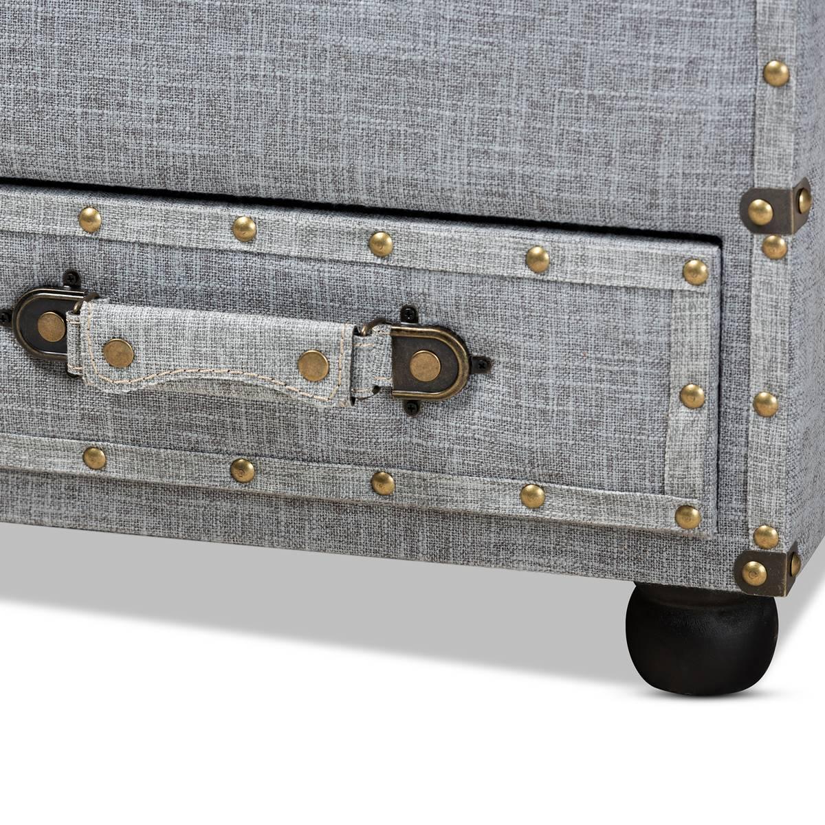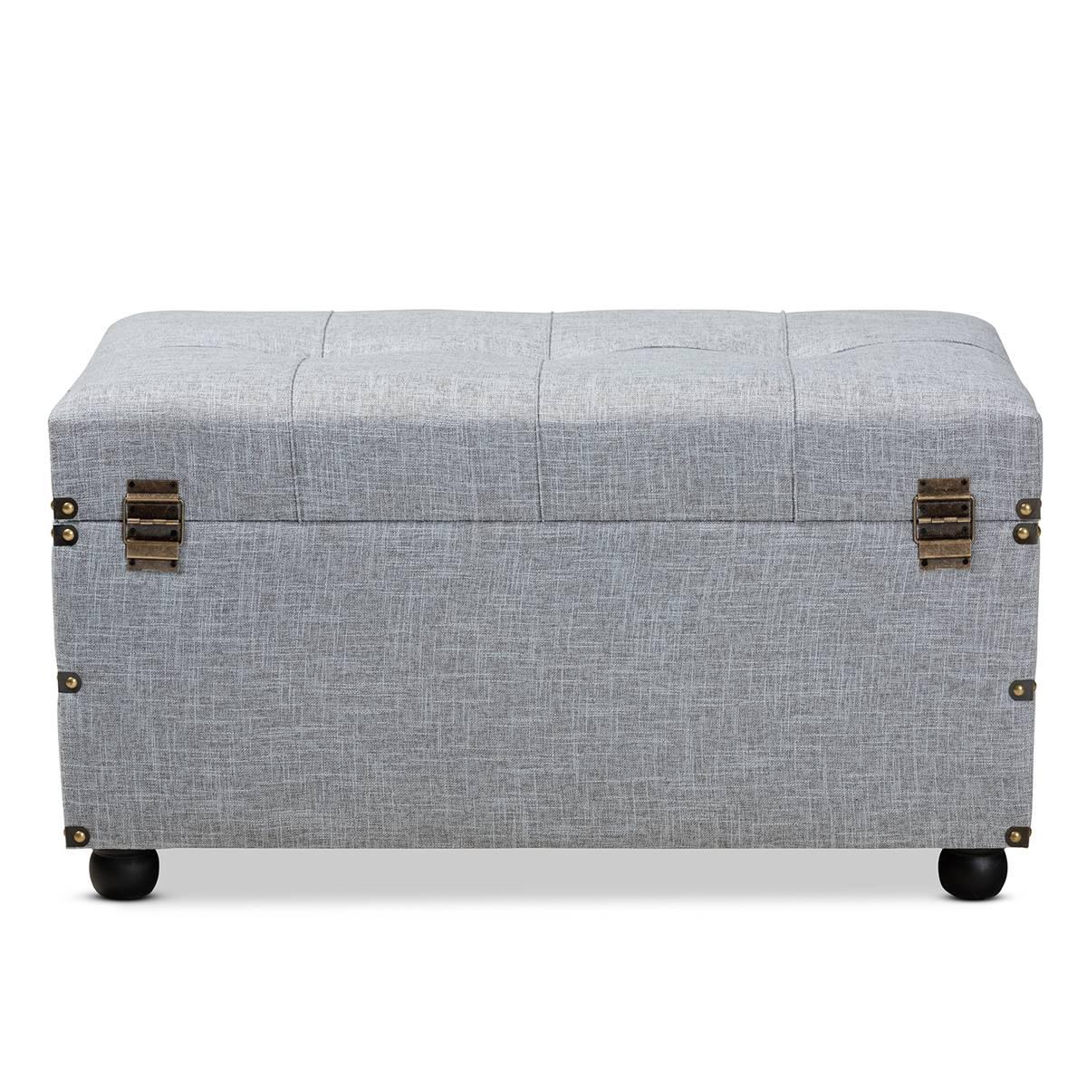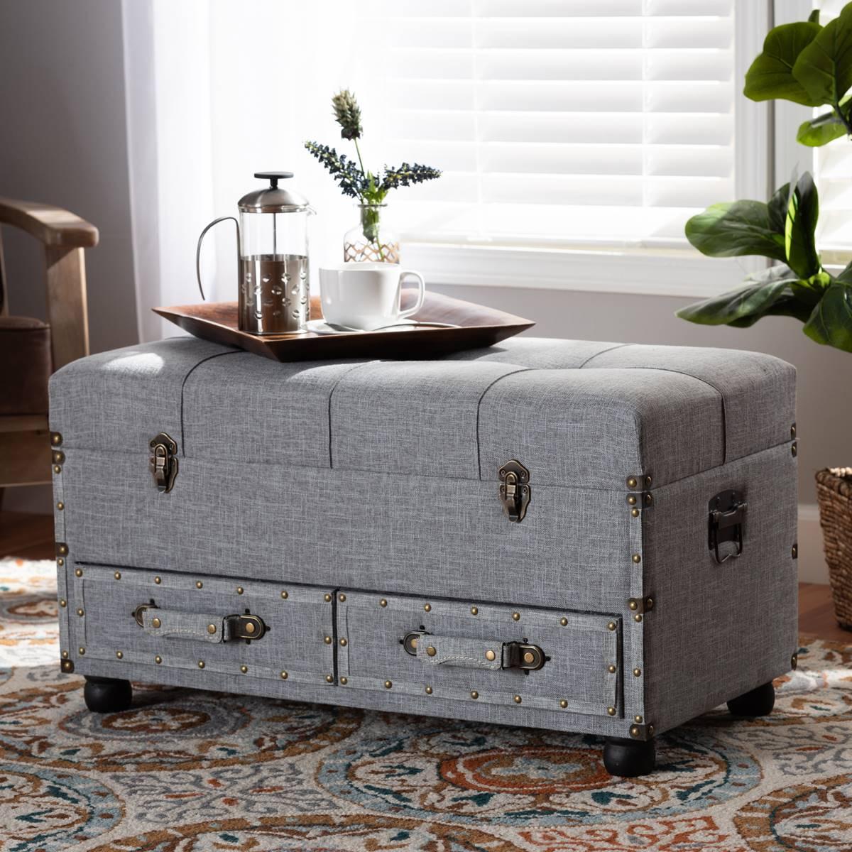 Stylish and versatile, the Baxton Studio Flynn storage trunk ottoman is an easy addition to any space. Set on top of black bun feet, the Flynn is upholstered in a chic grey linen-like fabric and features a cushioned lift-up lid that reveals extensive storage space. Two drawers located at the bottom provide additional storage space. Inspired by vintage steamer trunks, the Flynn is accented with antique brass latches and handles. Brass nailheads and button tufting add an extra dose of style. This versatile piece can be used as an ottoman, coffee table, or storage trunk.