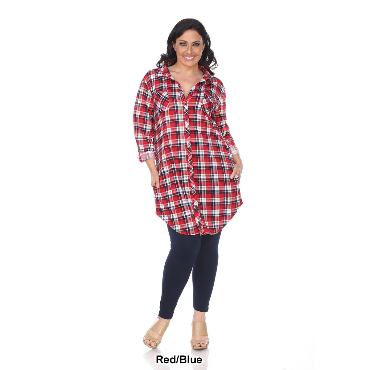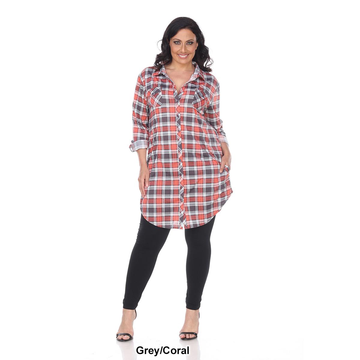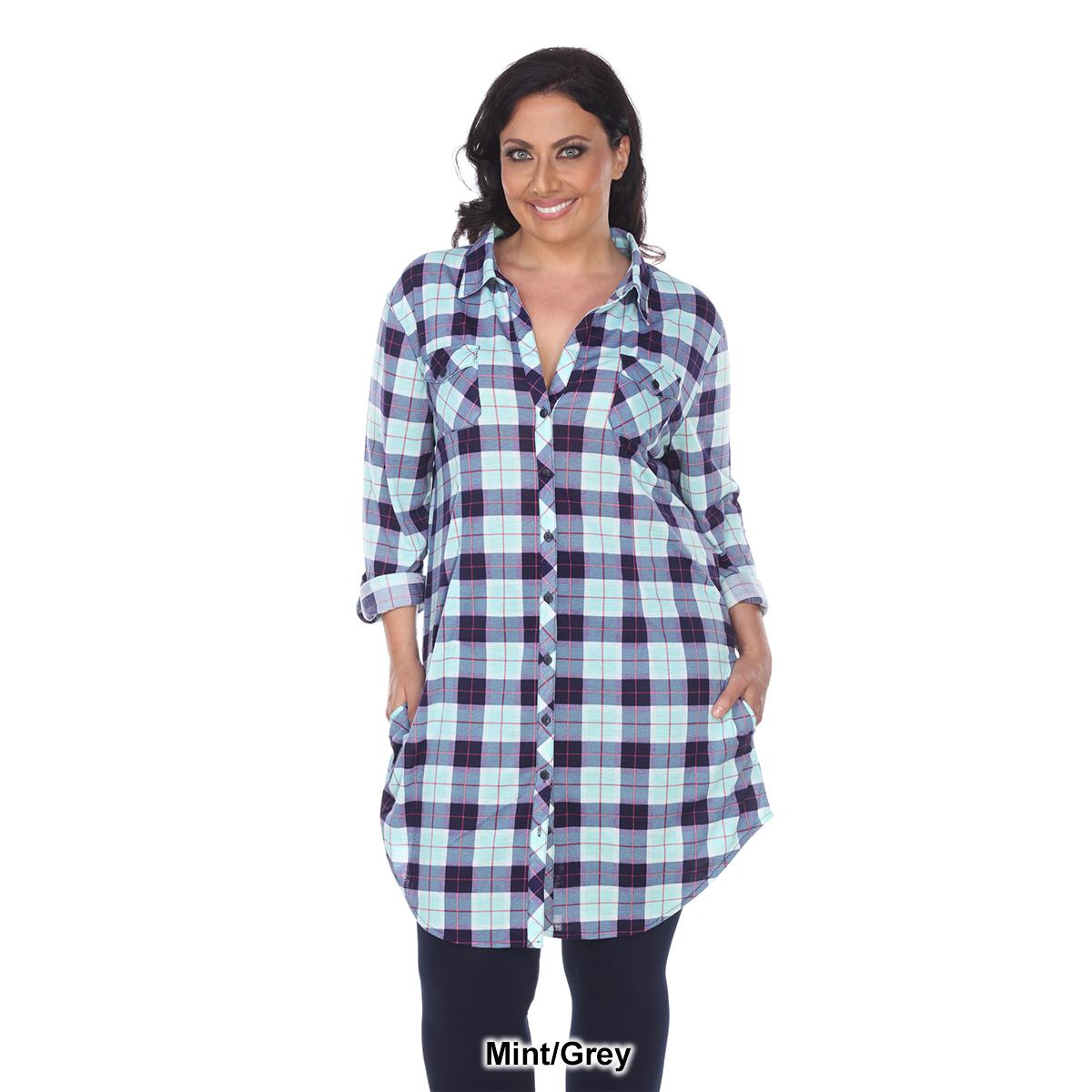 Description This Plus Size White Mark button front tunic shirtdress features an allover yarn dyed stretchy knit plaid pattern with long sleeves that have buttoned cuffs you can...