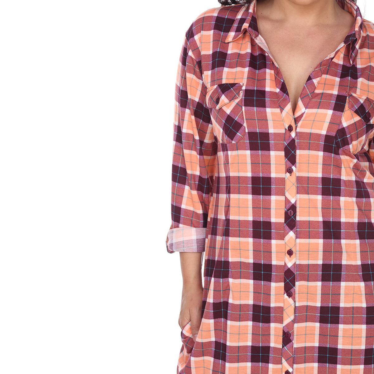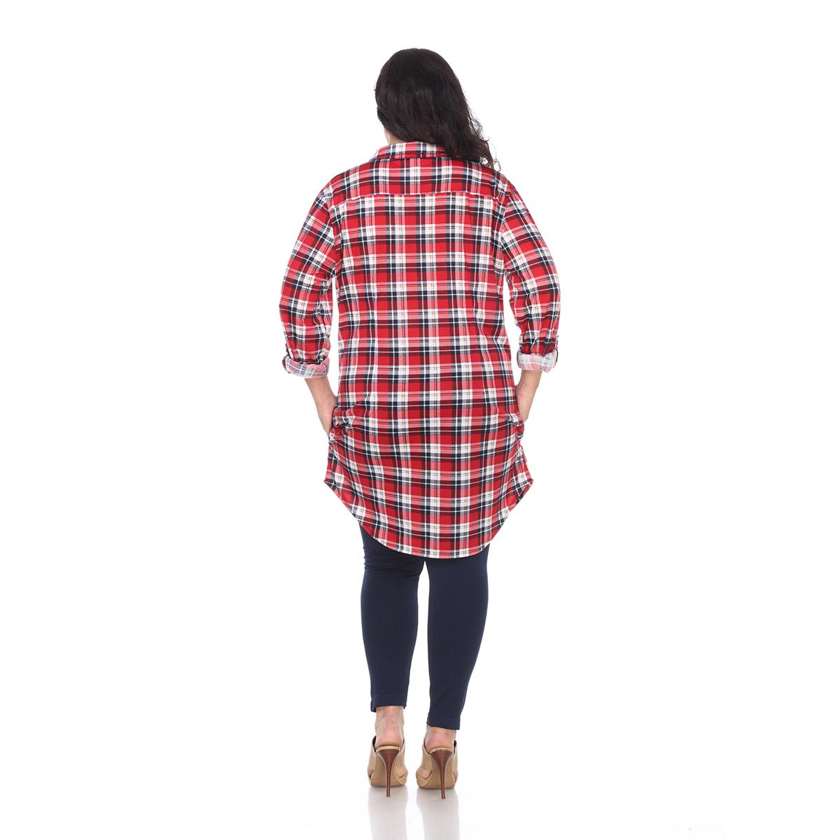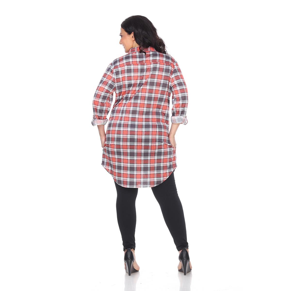 Description This Plus Size White Mark button front tunic shirtdress features an allover yarn dyed stretchy knit plaid pattern with long sleeves that have buttoned cuffs you can...
