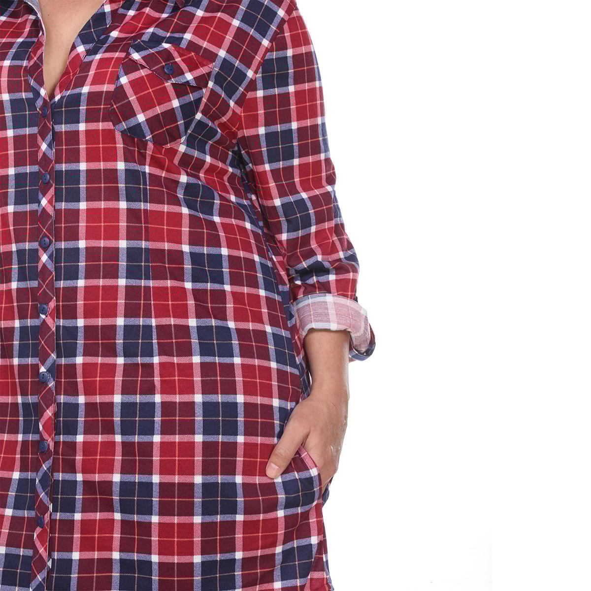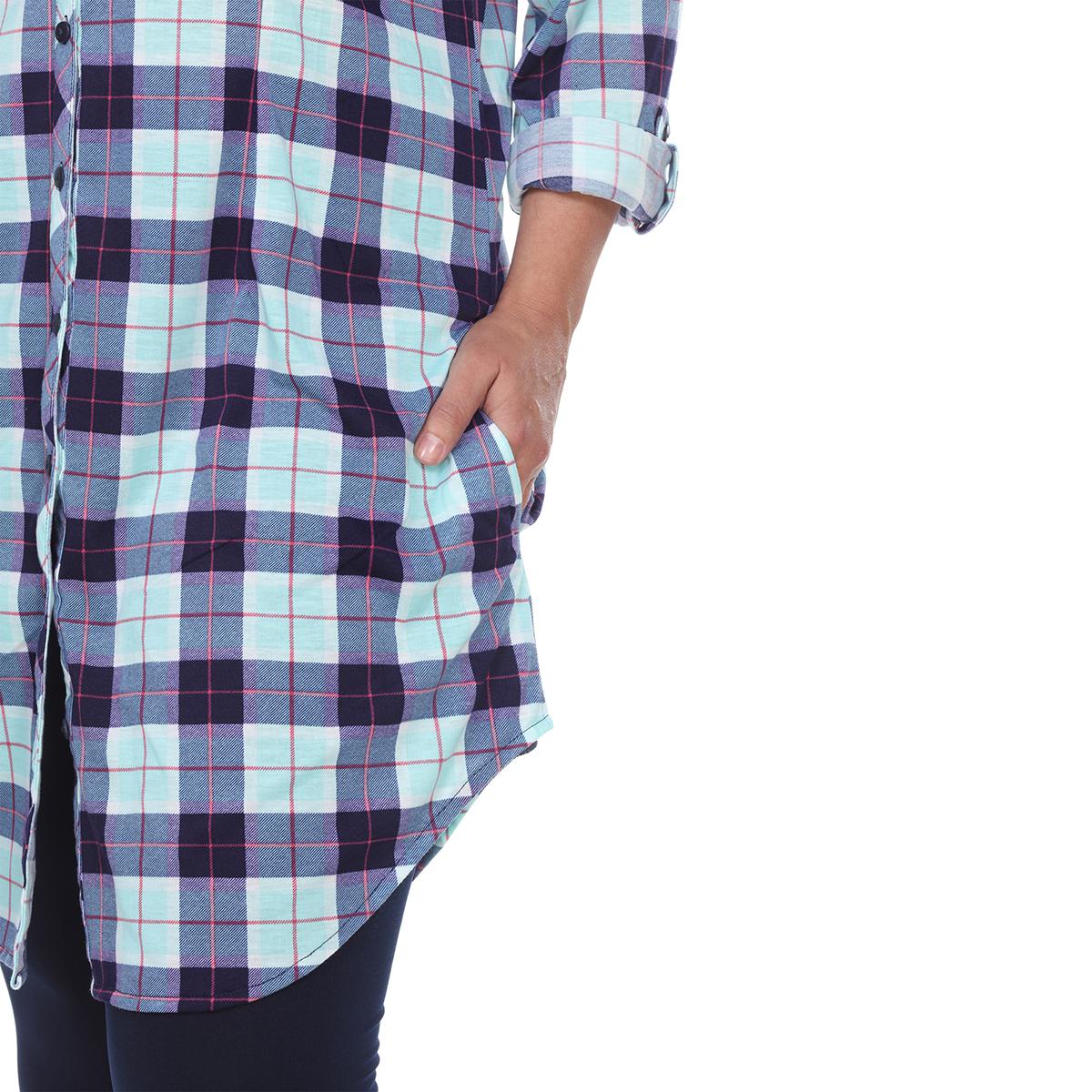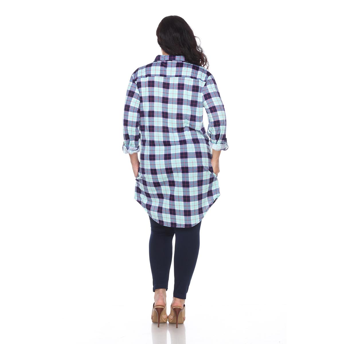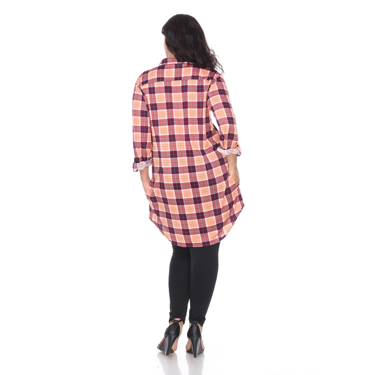 This Plus Size White Mark button front tunic shirtdress features an allover yarn dyed stretchy knit plaid pattern with long sleeves that have buttoned cuffs you can roll and tab to 3/4 length.