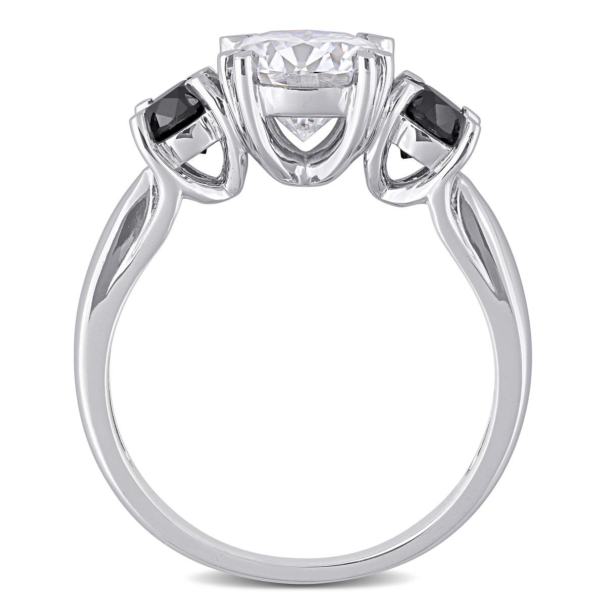 This ravishing Diamond Classics™ 3-stone black diamond engagement ring is a combination of style and class. Crafted in luminous 10kt. white gold, this modern wedding ring features a round-cut glowing created white moissanite center stone flanked by a round-cut black diamond on each side.