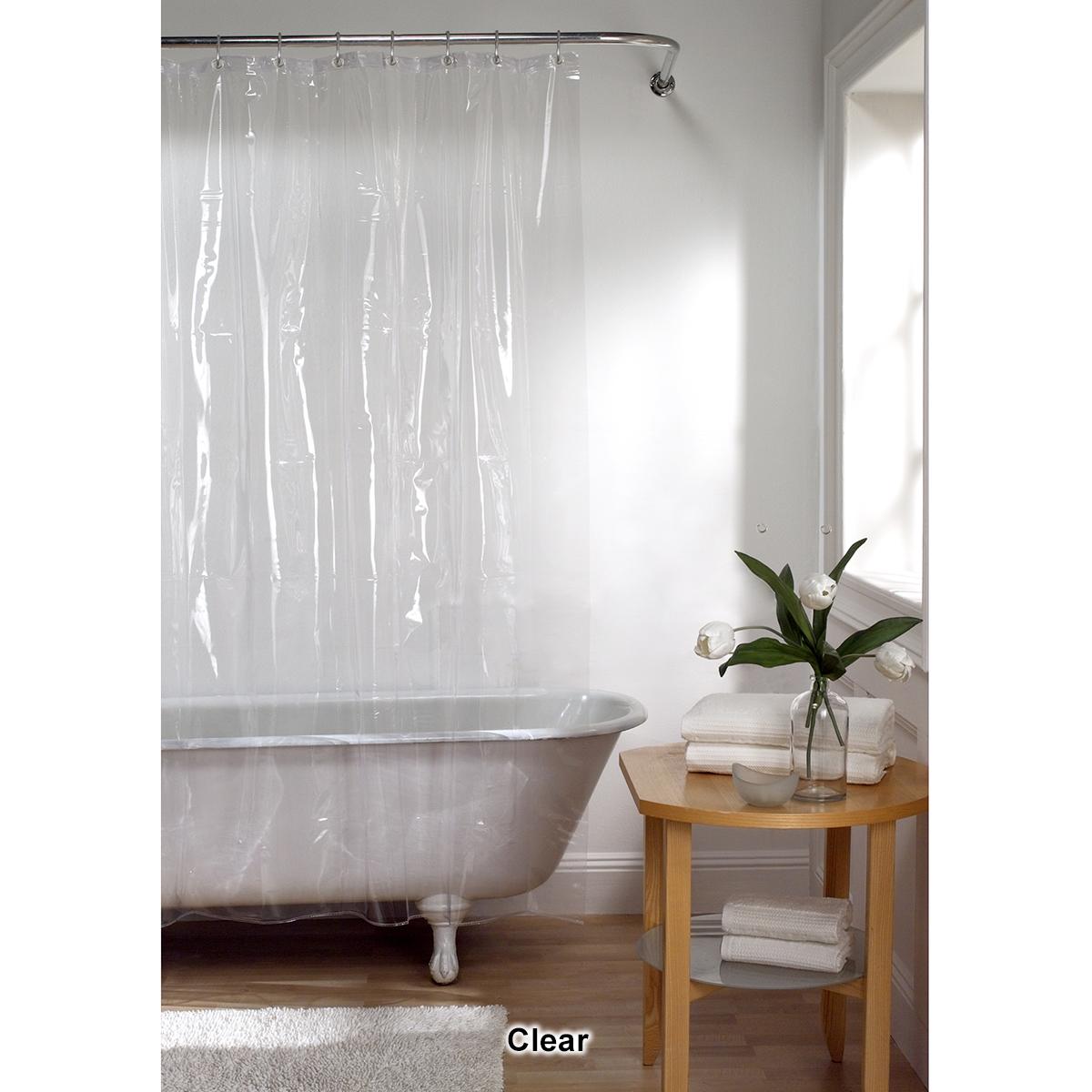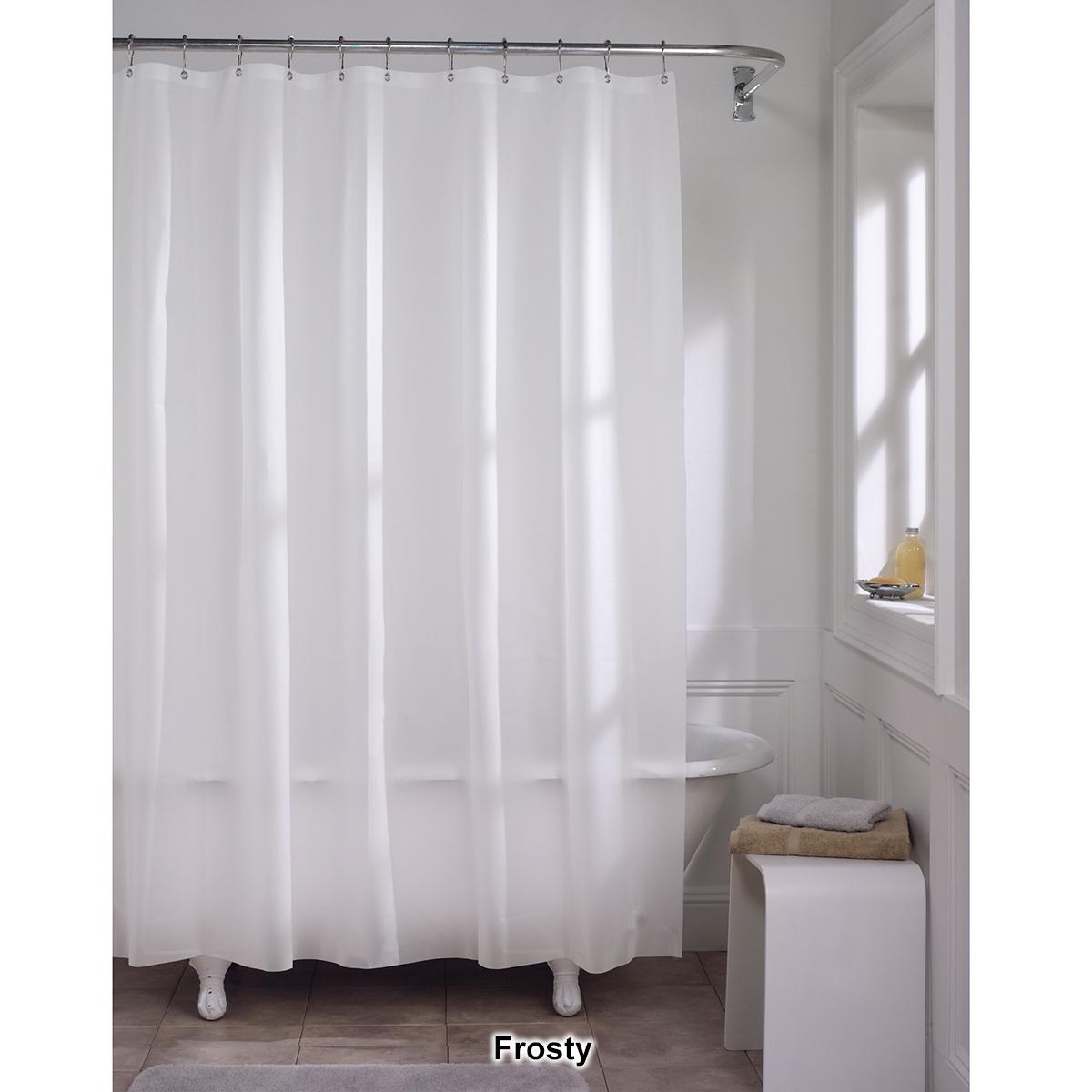 Antibacterial shower curtain liner features a reinforced nylon mesh header, rustproof metal grommets, and is mildew resistant.