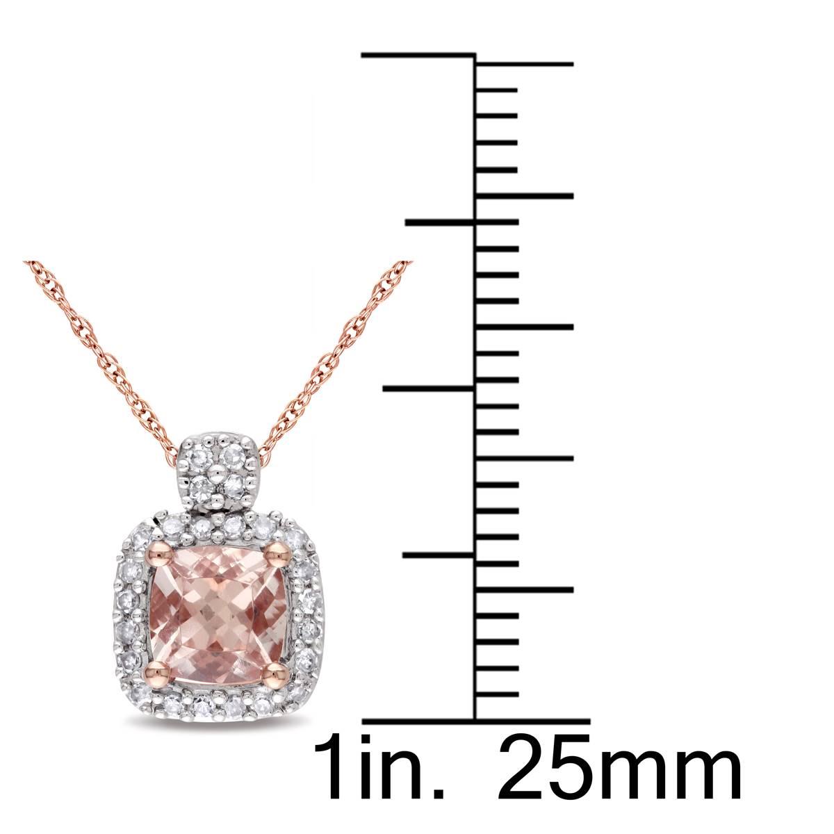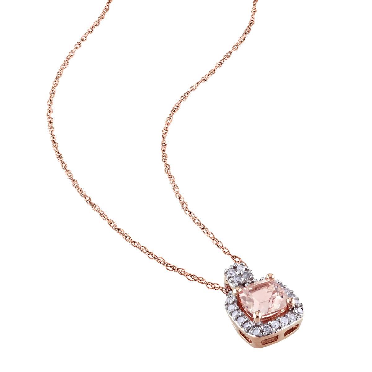 An exquisite symbol of your eternal love, this Gemstone Classics™ 10kt. rose gold diamond cushion pendant sparkles for a luxurious look. The pendant features a morganite gemstone and 24 round-cut, prong-set diamond accents. It is hung on a 17-inch rope chain and is secured with a spring-ring clasp.