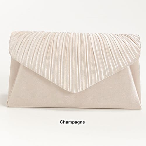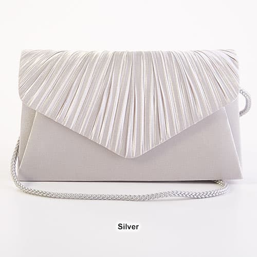 Description This elegant Jessica McClintock pleated envelope clutch has a pleated flap and a magnetic snap closure. The corded shoulder strap has a 22" drop. The interior is...