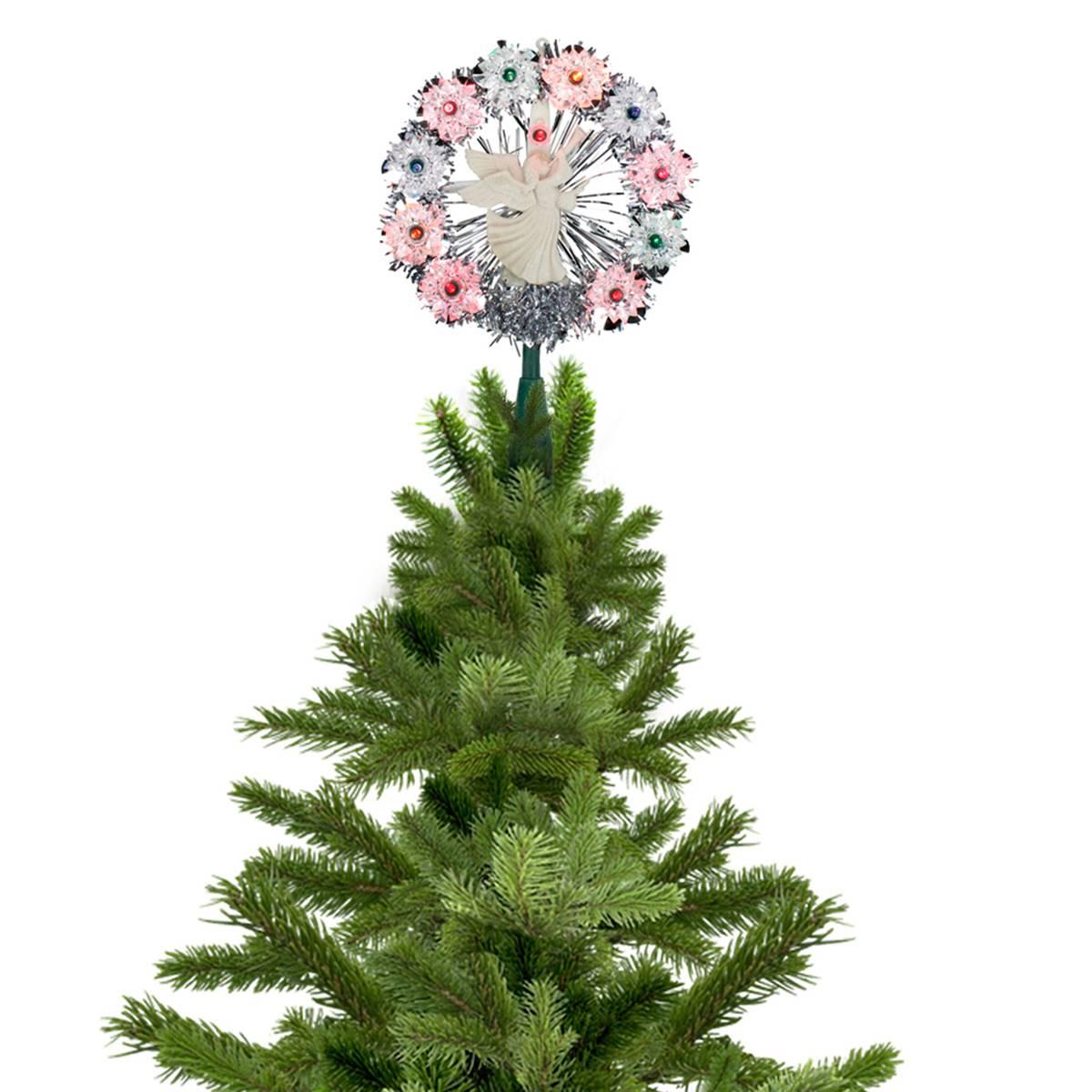 Add a vintage touch to the crown of your Christmas tree with this Northlight Seasonal Silver Tinsel Wreath with Angel Tree Topper. It has a shimmering tinsel wreath with star lights and an angel in front of the holographic tinsel. This tree topper will be the perfect finishing touch to your holiday decor. If one bulb burns out the rest will stay lit. This topper comes with replacement bulbs, spare fuse, and cone to attach to the tree.