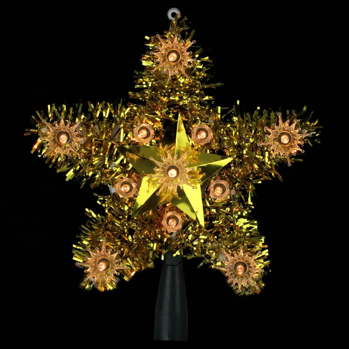 This retro Northlight Seasonal Gold Star Christmas Tree Topper screams nostalgia with its gold tinsel border. Clear lights offer a warm candle-like glow to make your tree look more attractive. If one bulb burns out, the rest will stay lit. This topper comes with replacement bulbs, spare fuses, and cone to attach to the tree. Contains 1 plug with end connector which allows you to stack multiple lighted items together, not to exceed 210 watts.