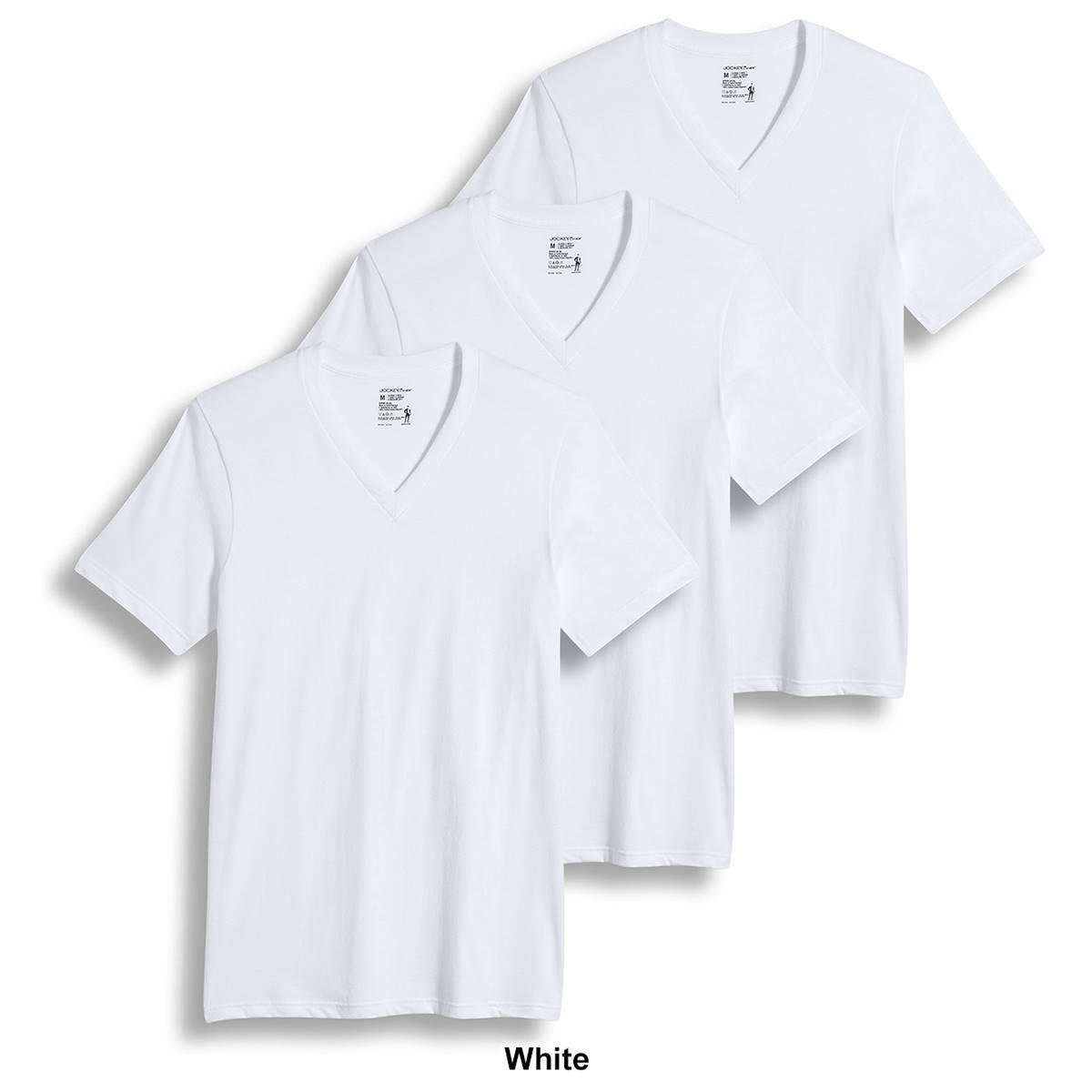 This Mens Jockey® 3-pack of v-neck t-shirts is a comfortable classic with a reinforced collar and sweat-wicking fabric. STAYNEW® technology reduces pilling and fading while DIAMOND BRIGHT® technology helps keep whites looking whiter, wash after wash. A tag-free design eliminates irritation for all-day wear.