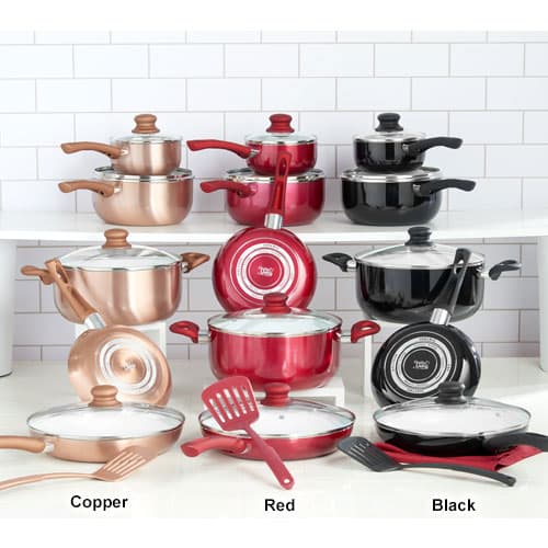 This Healthy Living 10-piece non-stick ceramic cookware set includes a 5-quart Dutch oven with lid, a 10-inch fry pan with lid, an 8-inch fry pan, 1 and 3-quart saucepans with lids, and a spatula. Vented glass lids. Dishwasher and oven are safe at 350 degrees. PFOA and PTFE are free. Aluminum base with ceramic coating.