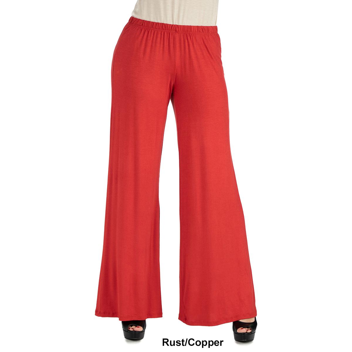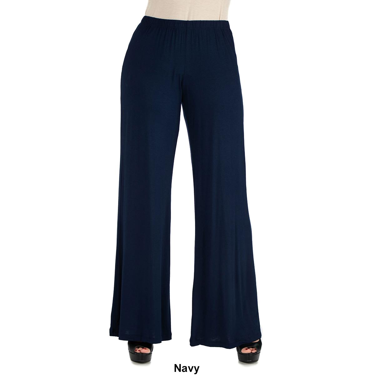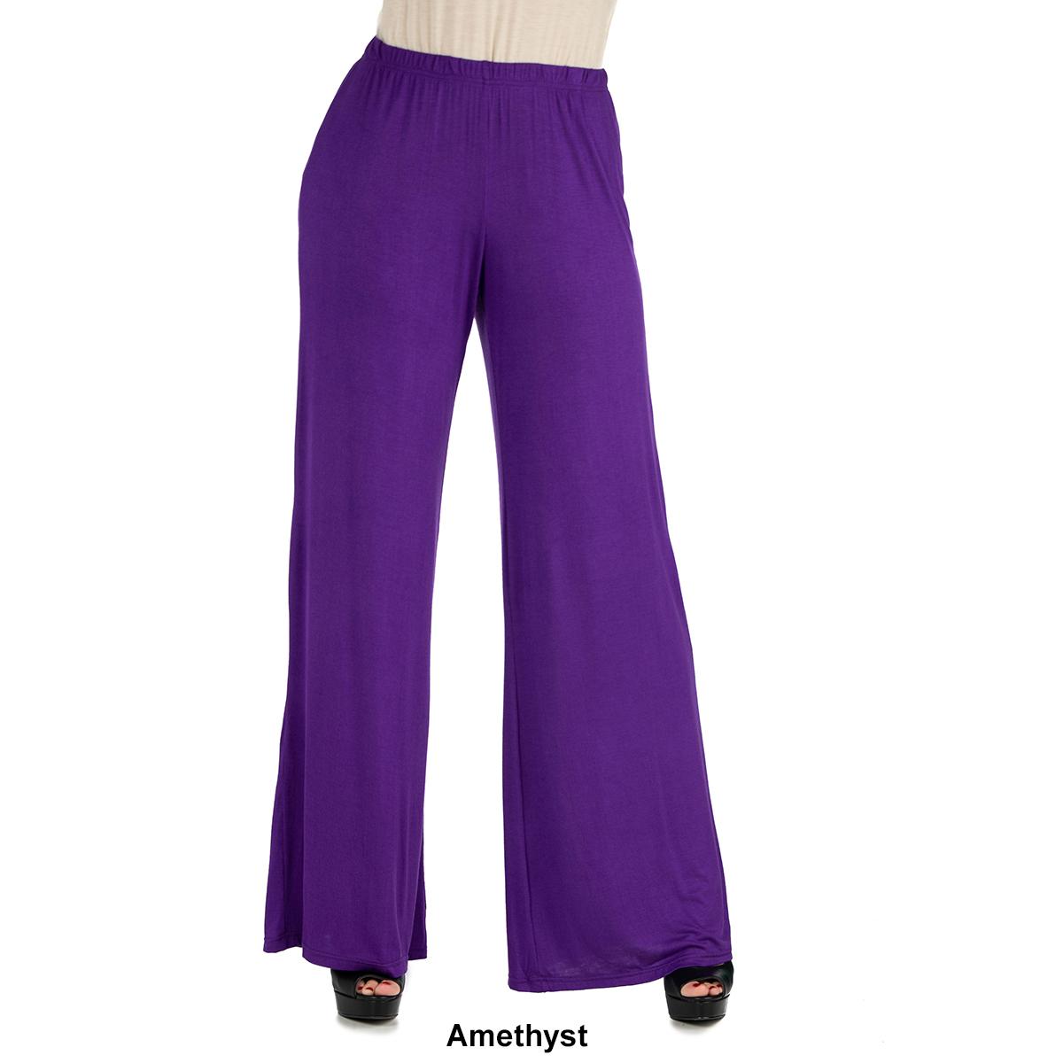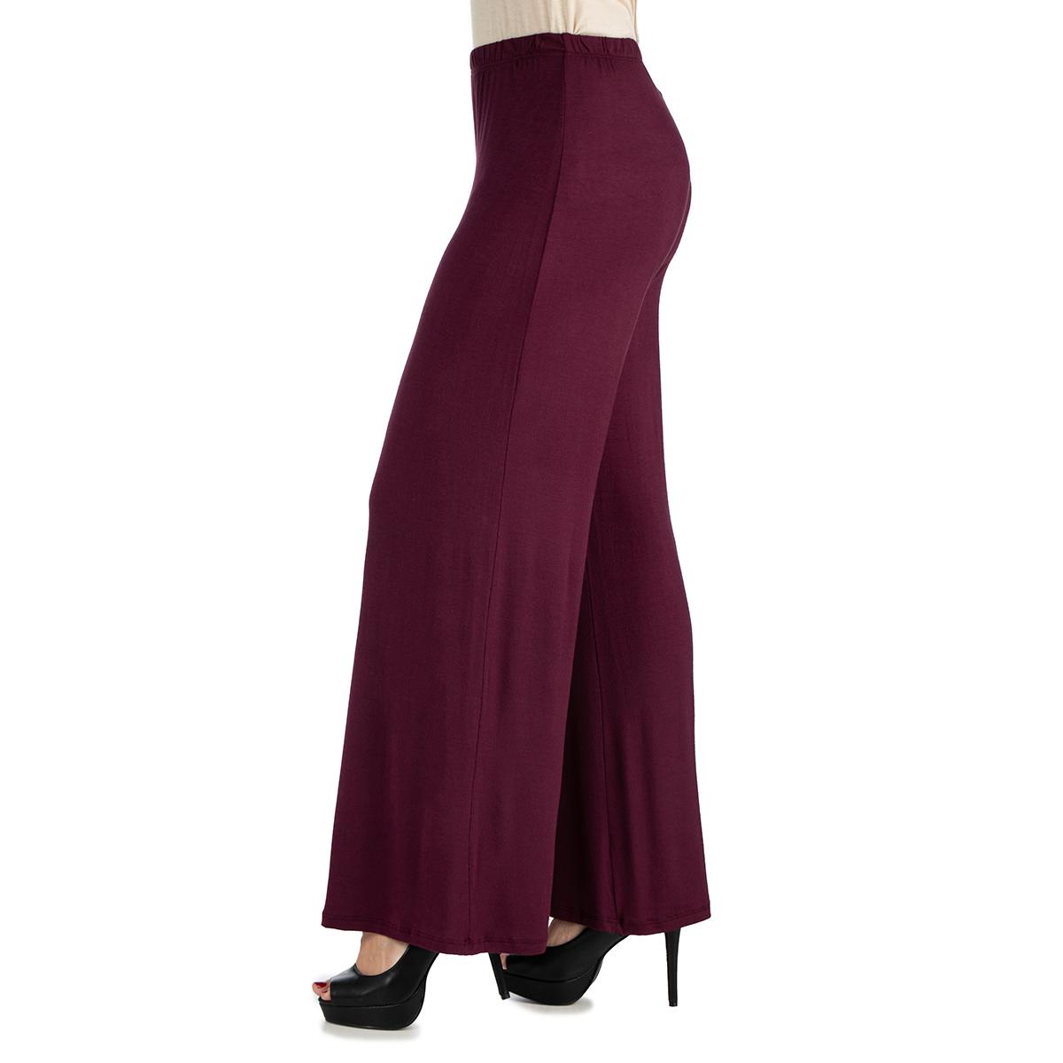 These comfortable Womens 24/7 Comfort Apparel palazzo pants feature an elastic waist, stretch material, flared pant legs, and a relaxed fit. Made from a comfortable stretch material these pants will be your favorite new pair.
