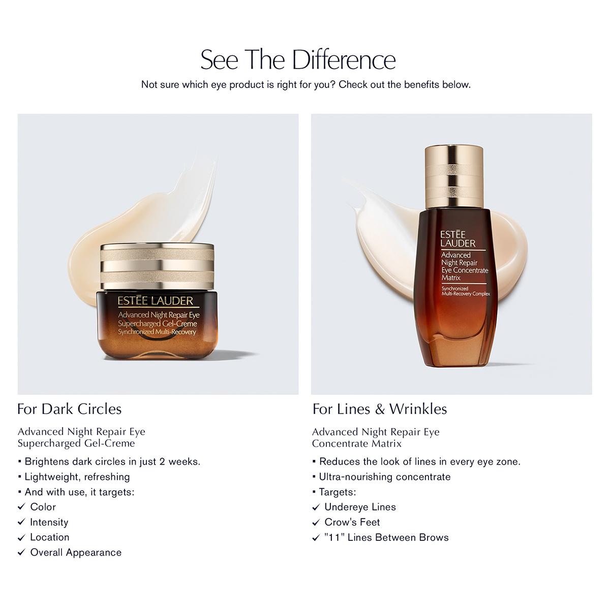 Estée Lauder™ Advanced Night Repair Eye Concentrate Matrix.An ultra-nourishing eye concentrate that reduces the look of lines in every eye zone, and also targets firmness, puffiness, and dark circles.-Let your eyes express the beauty of you. Fast Visible Repair. Youth-Generating Power.This ultra-nourishing eye concentrate reduces the look of lines in every eye zone and targets multiple eye area concerns: crow’s feet lines, “11” lines between brows, under-eye lines, wrinkles, loss of firmness, puffy eyes, and dark circles.Eyes bounce back—look more youthful, vibrant, healthy.Reduces the Look of Lines & Wrinkles