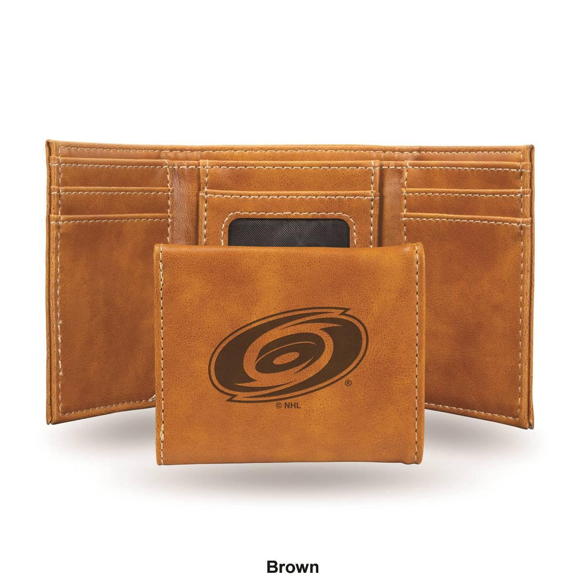 Carry a part of your favorite team with you and simultaneously keep your money safe with this Mens NHL Carolina Hurricanes trifold wallet. Made of faux leather, the 4-inch long and 3.25-inch wide wallet features a Carolina Hurricanes embossed logo, card slots, and an ID window for a complete look.