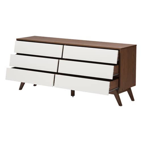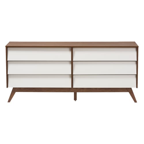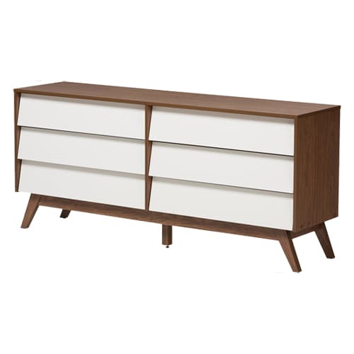 This Baxton Studio Hildon 6 drawer dresser has the perfect touch for any room. The slanted design of the drawers gives it extra character and individual style while the splayed legs showcase the retro modern look of the collection. It is constructed of engineered wood and provides you with extra storage space for your lingerie´s, linen and clothes. Set on 4 walnut finished legs, which elevate the drawers from the floor, this storage chest of slanted drawers is a great addition to any bedroom. Wipe with a damp cloth to clean. Made Particle Board, MDF with PU Paper. Dimensions: 28”H x 63”W x 15.8”D.