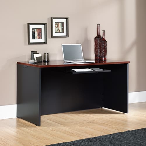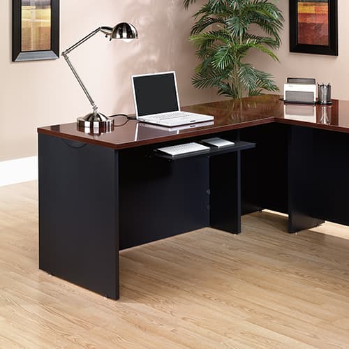 Sauder Via keyboard shelf with full extension slides. Soft Black finish. Dimensions: 3.5"H x 25.5"W x 15.75"D.
