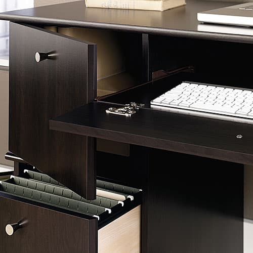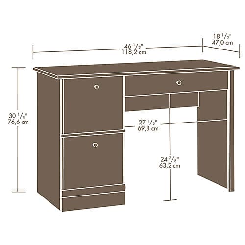 This Sauder computer desk features flip-down molding that reveals a slide-out keyboard/mouse shelf with metal runners and safety stops, hidden storage behind the simulated drawer front/door, a lower drawer that holds letter-size hanging files, and quick and easy assembly with a patented T-lock drawer system. Cinnamon Cherry finish. Dimensions: 30 1/8"H x 46 1/2"W x 18 1/2"D.