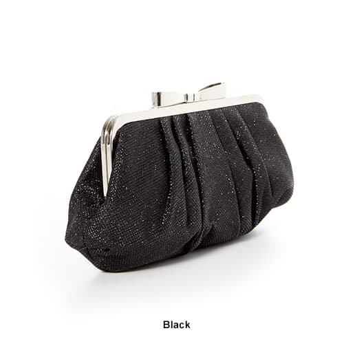 Sasha glitter frame clutch with bow features a shimmery exterior and removable chain strap. Dimensions: 6"H x 11"W x 3"D.