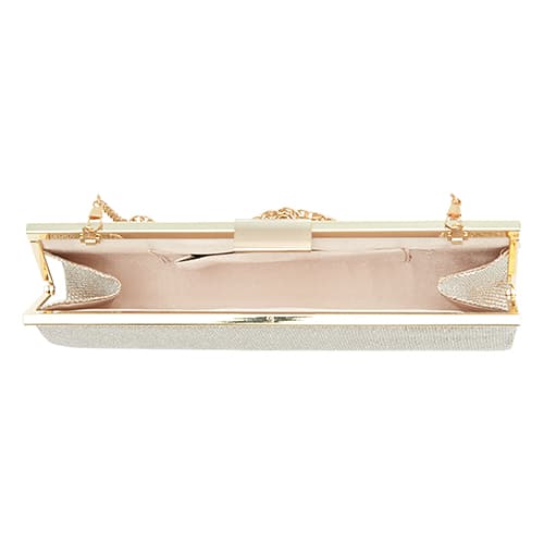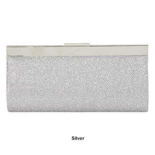 Sasha shimmer kisslock clutch evening bag features a snap closure with interior pocket and removable chain strap.